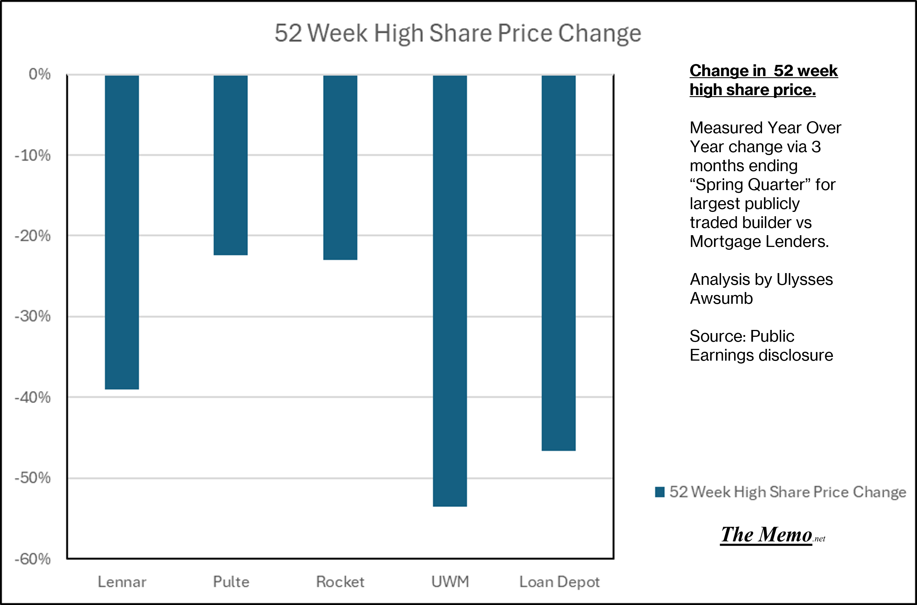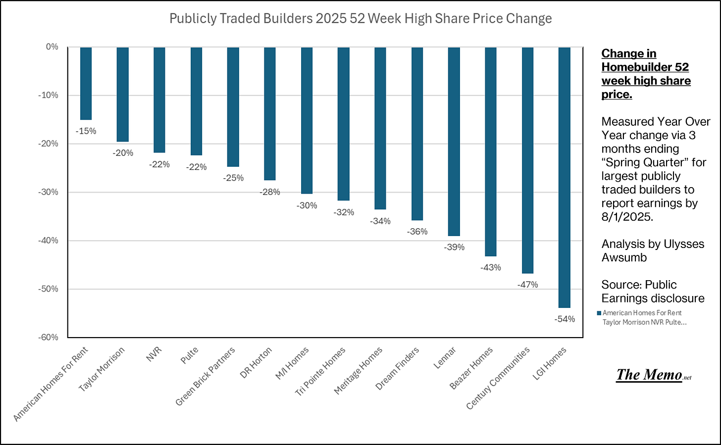 We’ve now got 14 of the largets pulbicly traded builders reporting Q2 or “Spring” quarter earnings. And the spring came in and left like a lion. While YOY share prices don’t seem too bad, when comparing 52 week highs, the same senitment becomes a ghost.