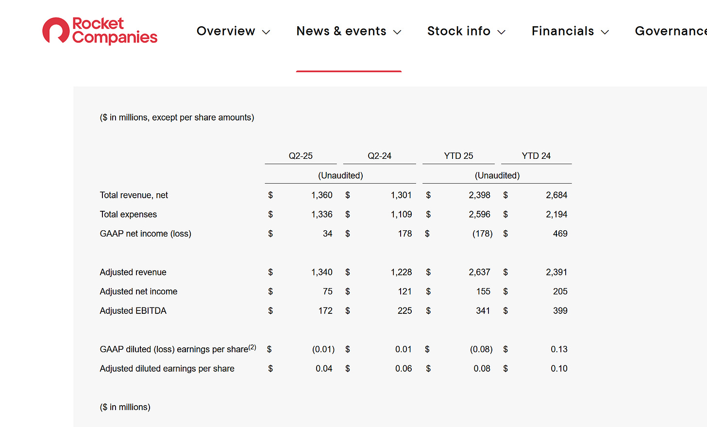 Rocket is reporting YTD losses: