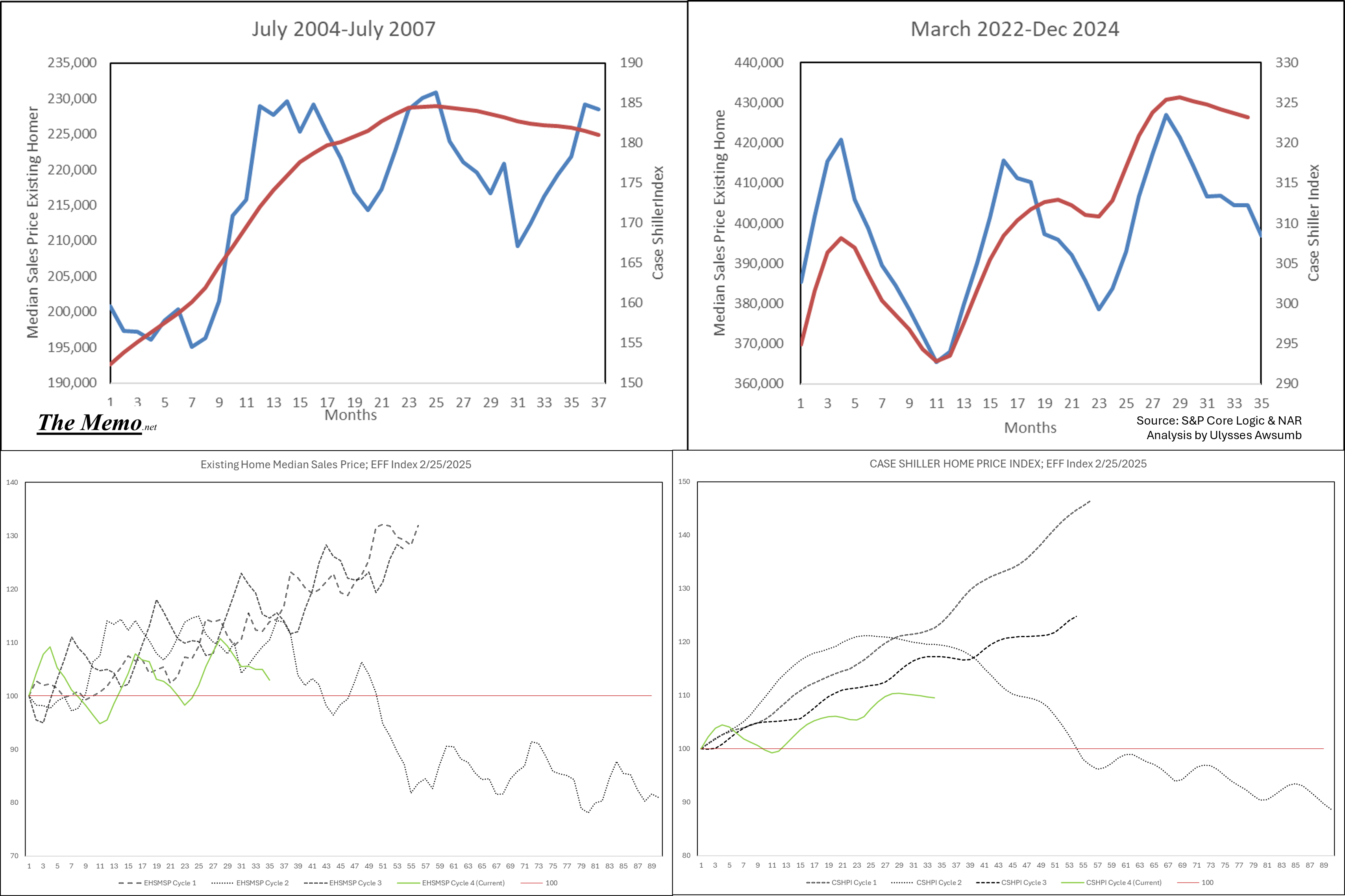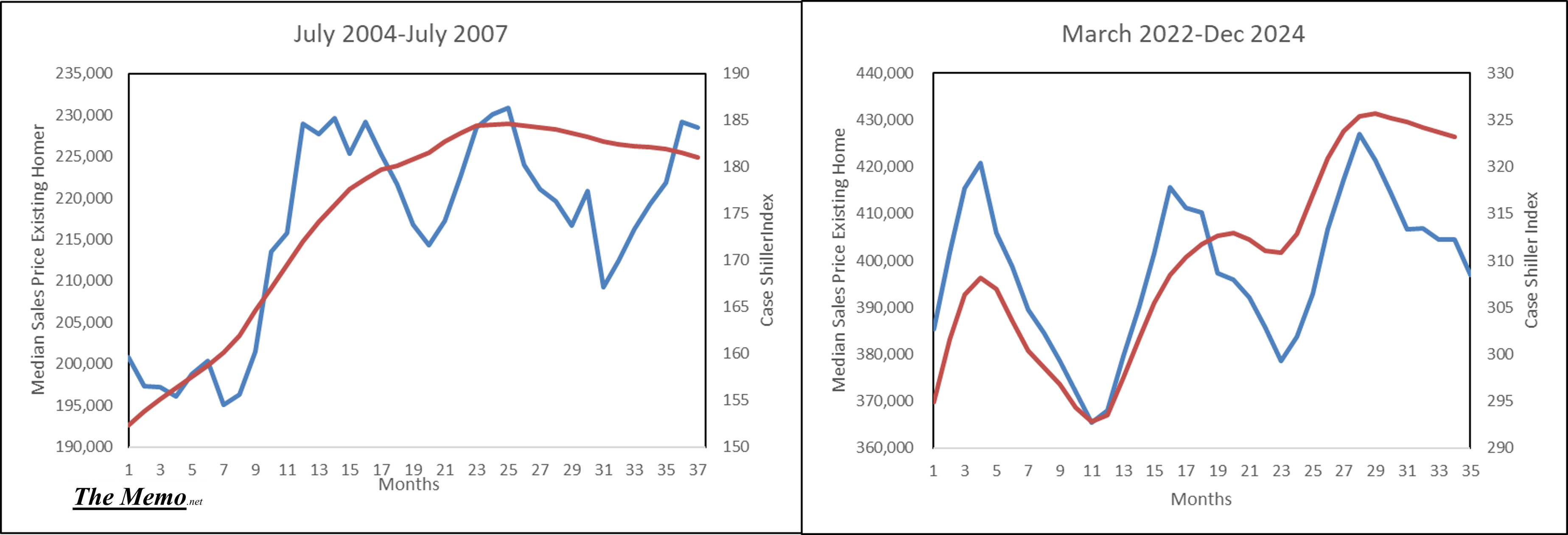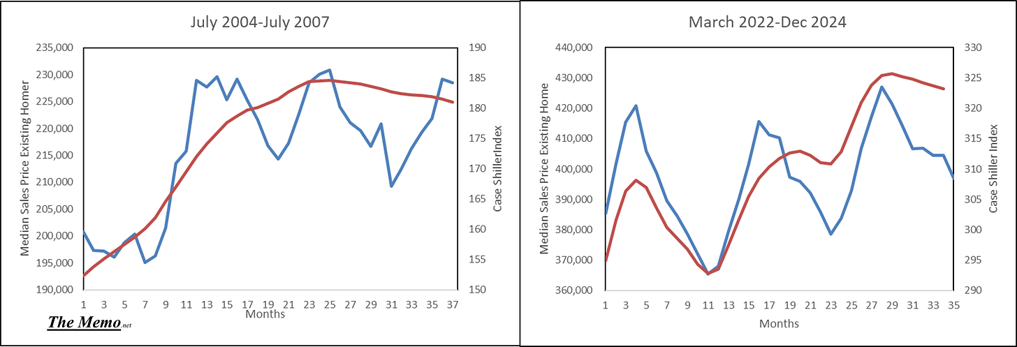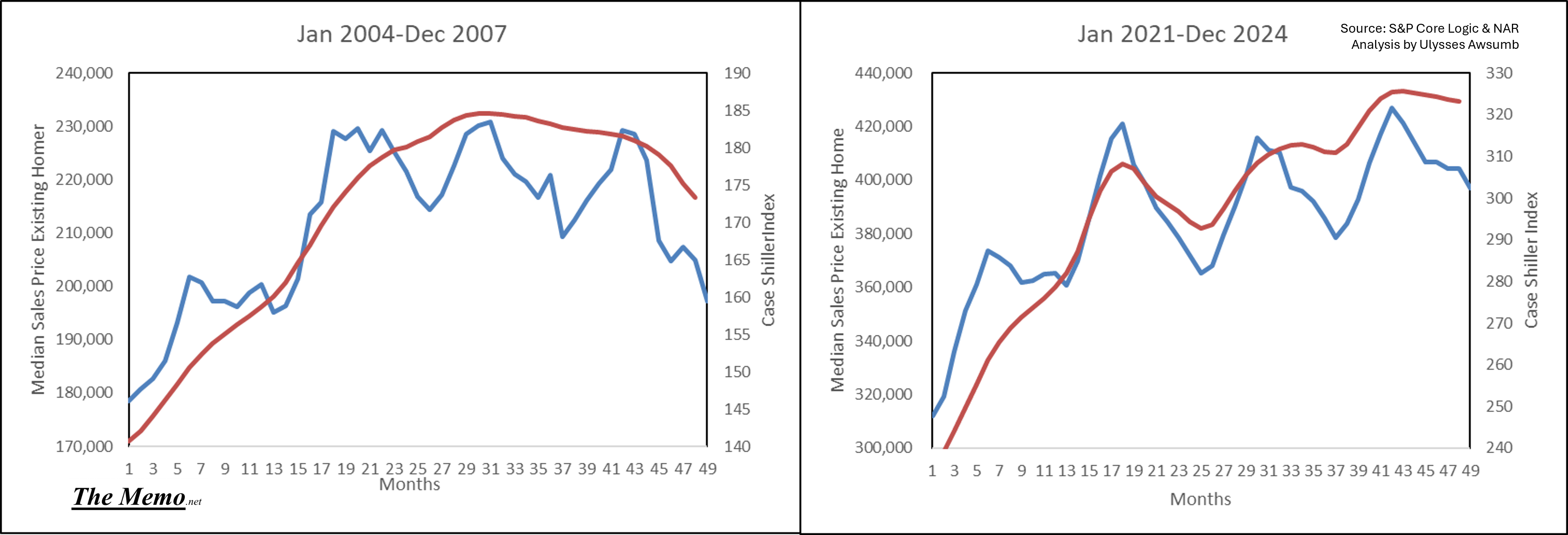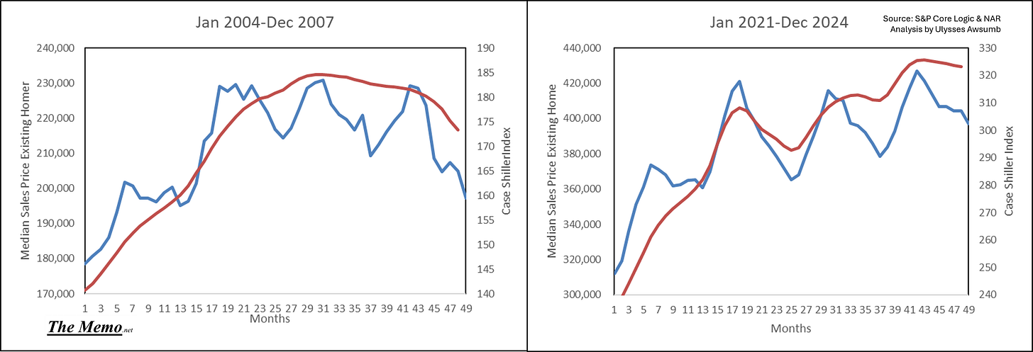 Case in point. Left 2004-2007, Right 2021-2024. 4 Year intervals. Median sales price for an existing home compared to Robert Schiller’s now S&P Core Logic Case Shiller Home Price Index.
