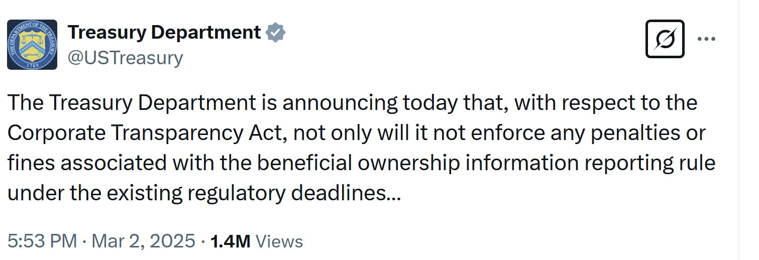 The Treasury Department announced it won’t take action against U.S. Citizens for failing to comply with the Corporate Transparency Act. See Attachments.