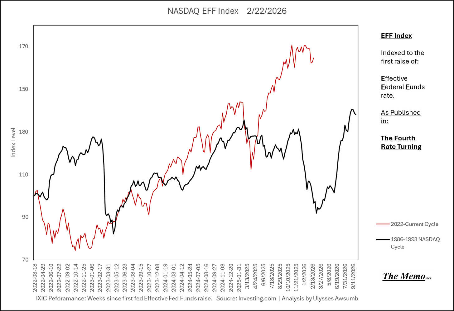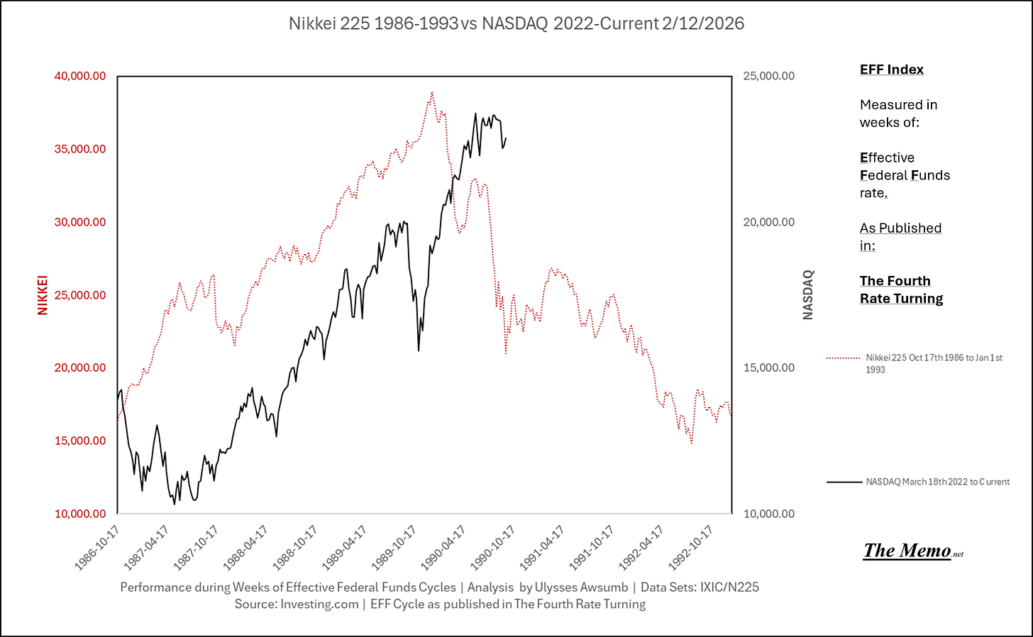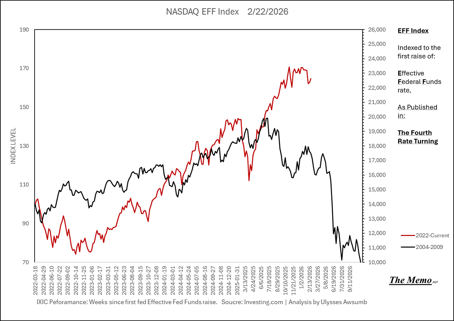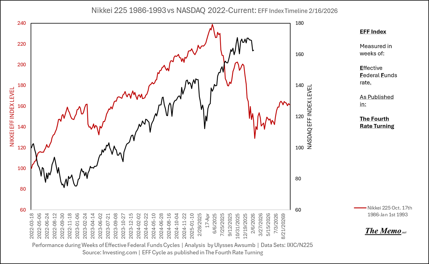 Using the EFFing timeline (Effective Federal Funds Cycles, for the new folks) comparing today’s NASDAQ to the 1985-1993 Nikkei Cycle, there’s some remarkable resemblances.