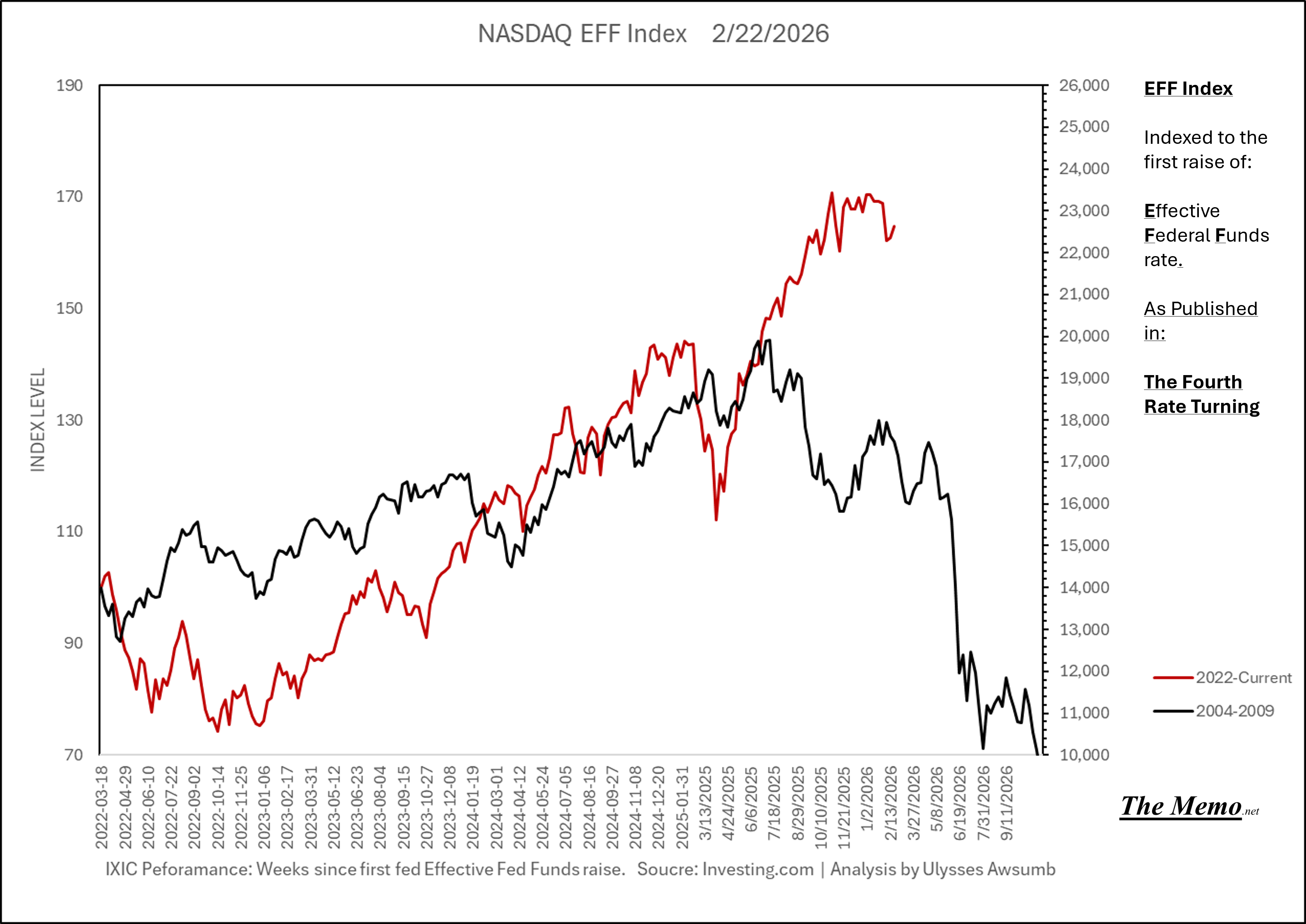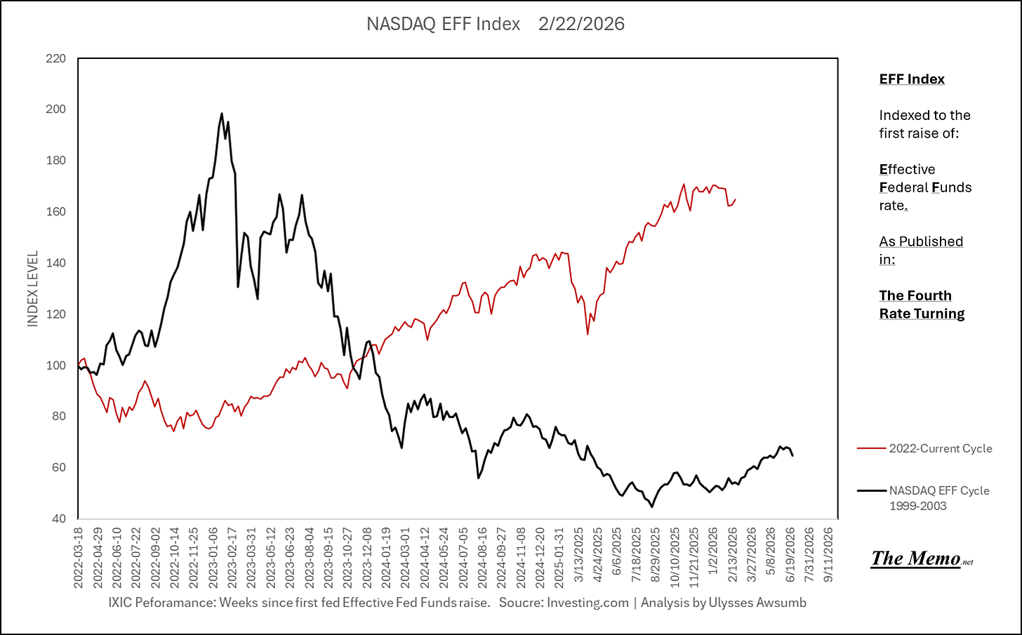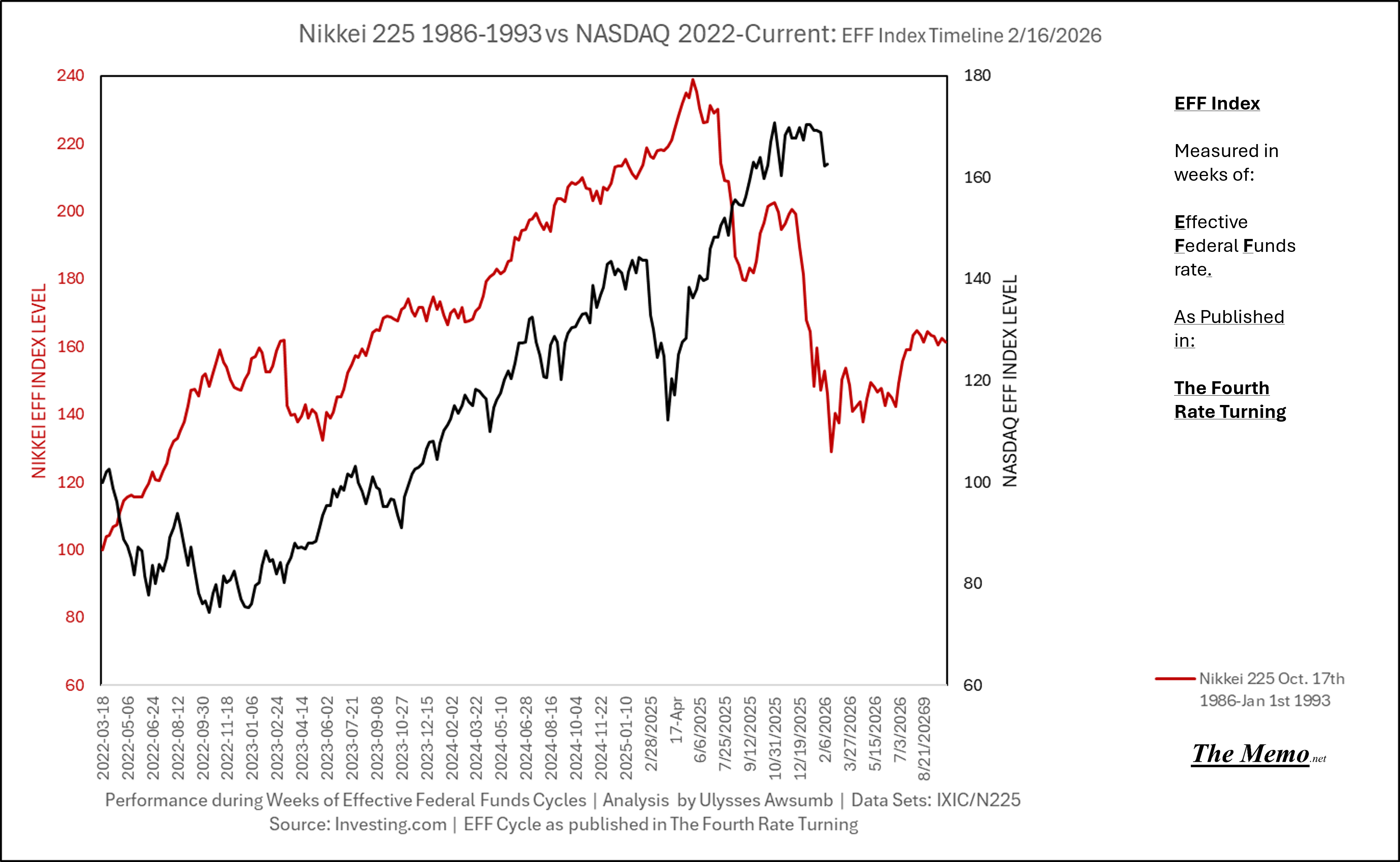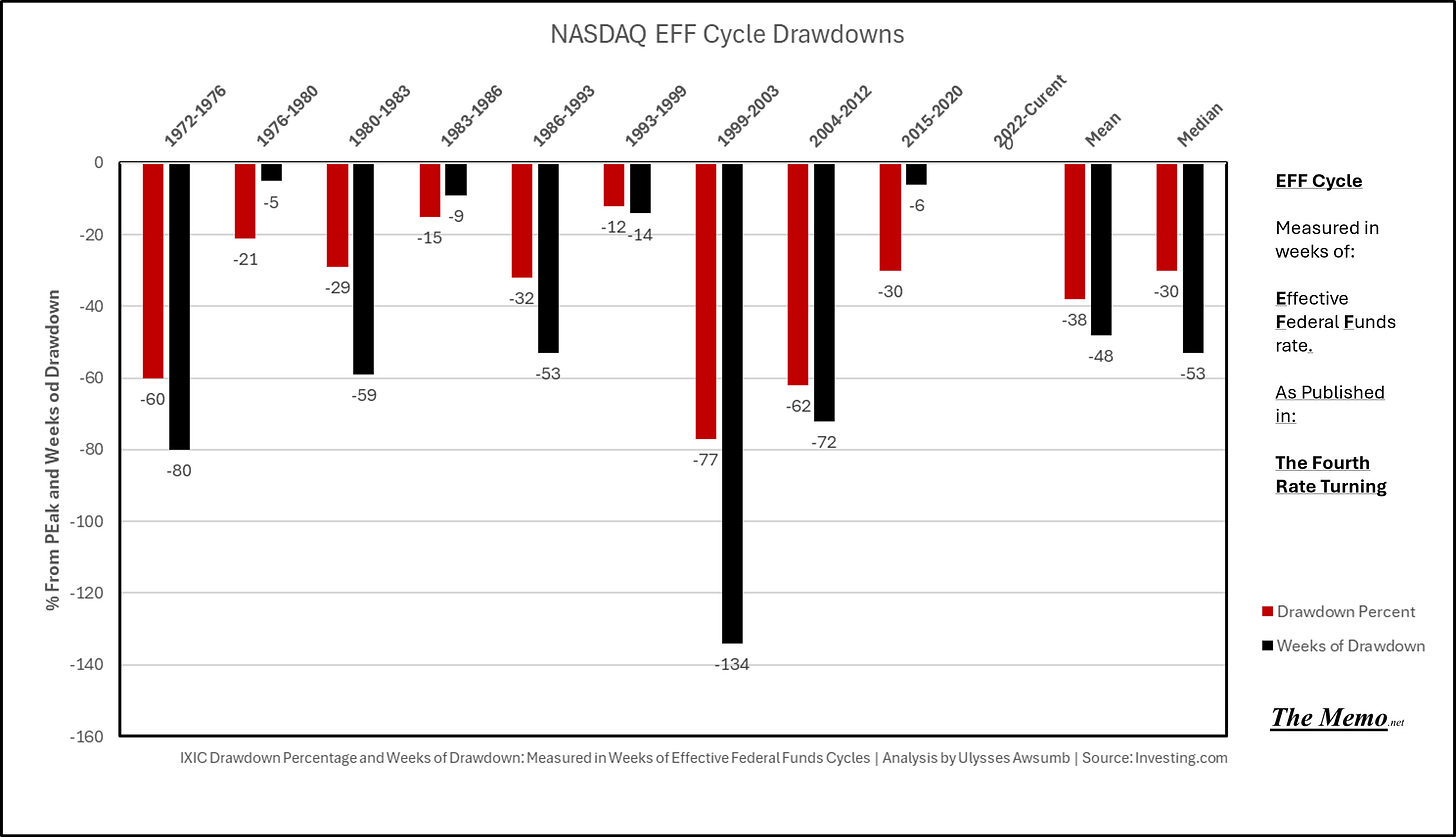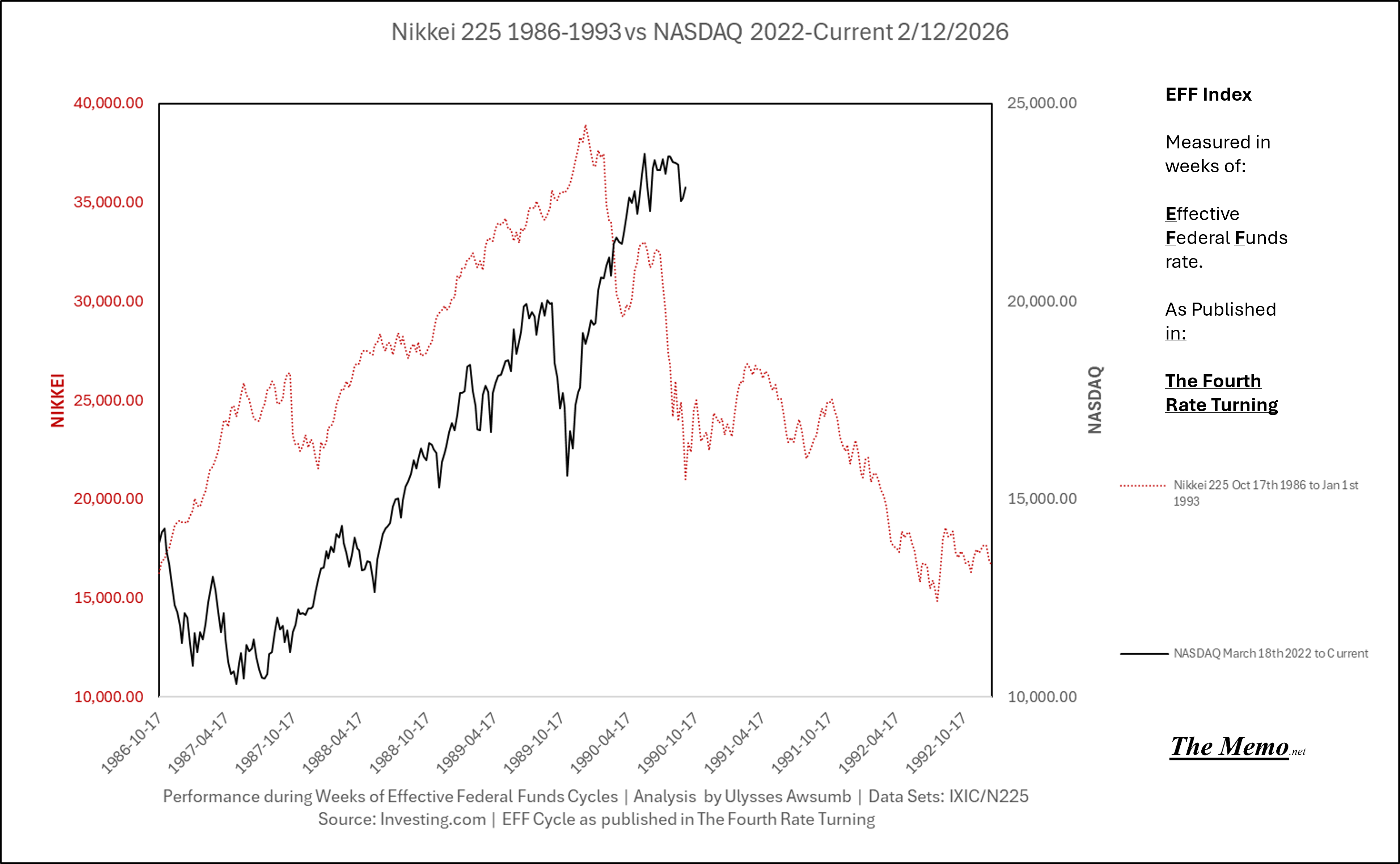 Using the EFFing timeline (Effective Federal Funds Cycles, for the new folks) comparing today’s NASDAQ to the 1985-1993 Nikkei Cycle, there’s some remarkable resemblances.
