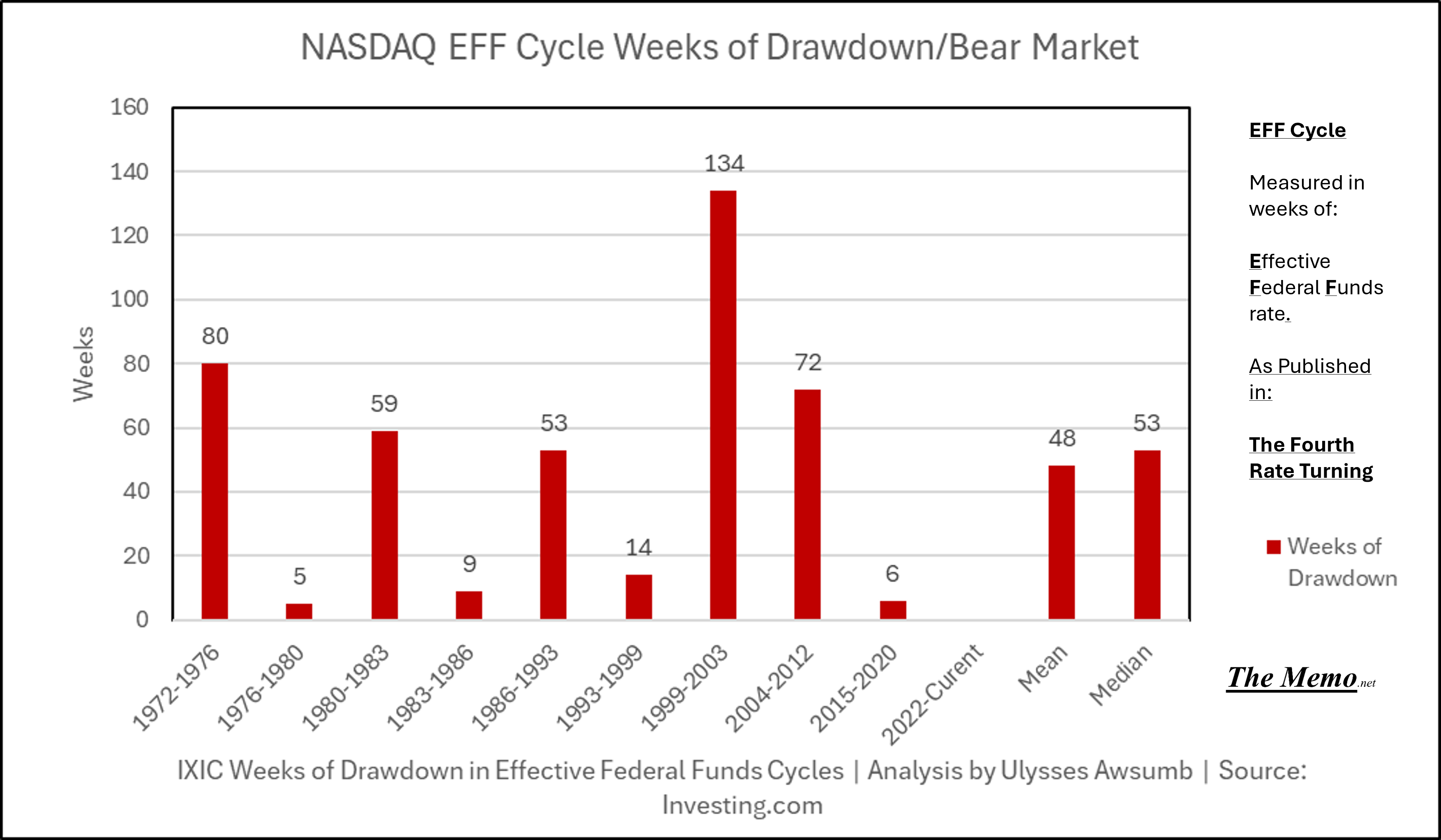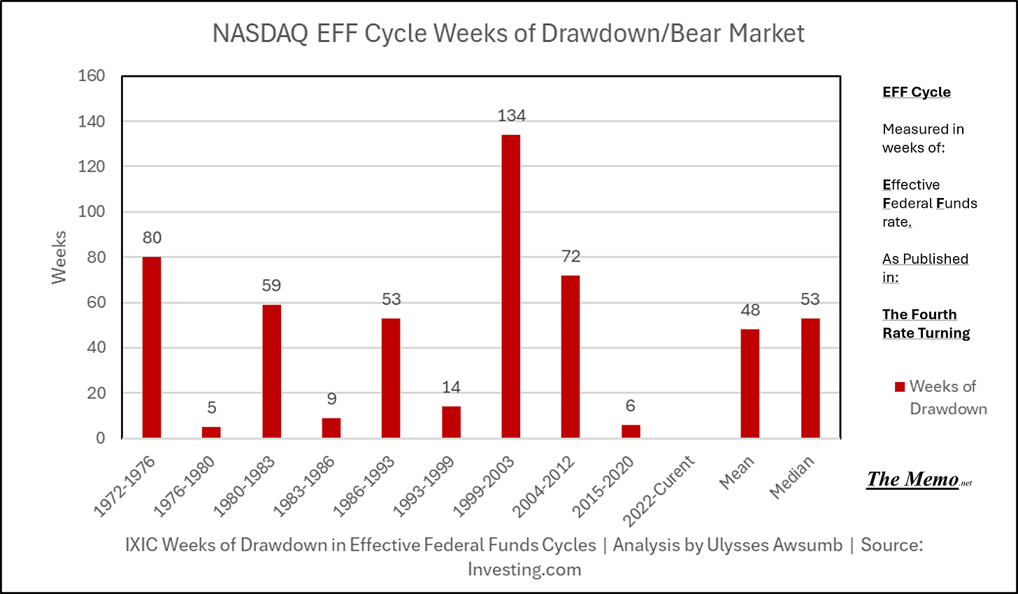 This chart shows the number of weeks of drawdown/bear market corresponding to each cycle.