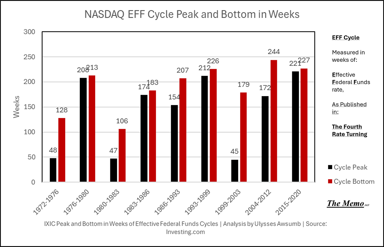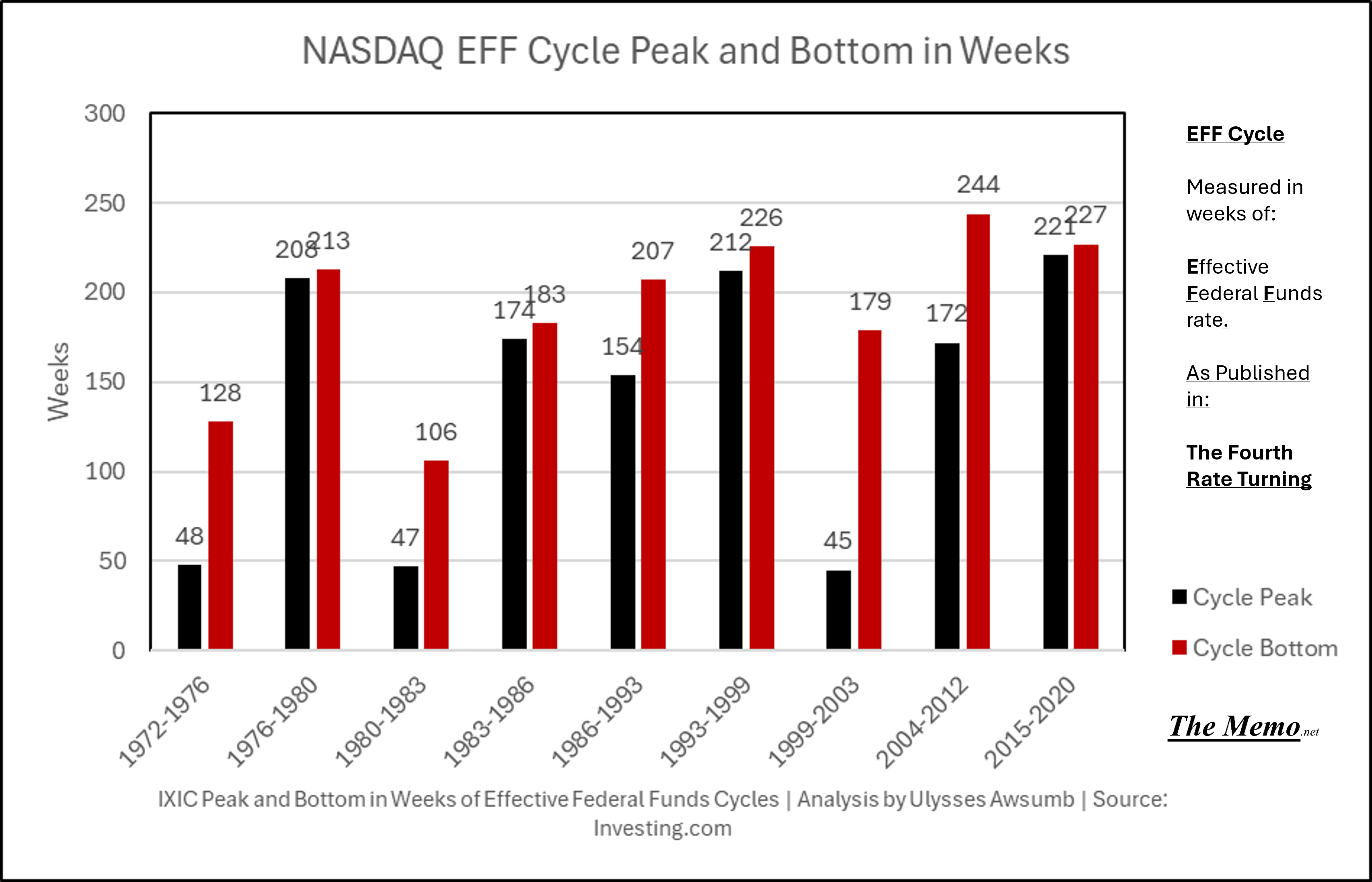 Here are the last 9 cycles (going back almost to NASDAQs inception). 1972-1976 being the first measurable EFF Cycle in terms of NASDAQ. This chart represents the weeks that markets Peaked and the week they bottomed/troughed before recovery and a new spring.