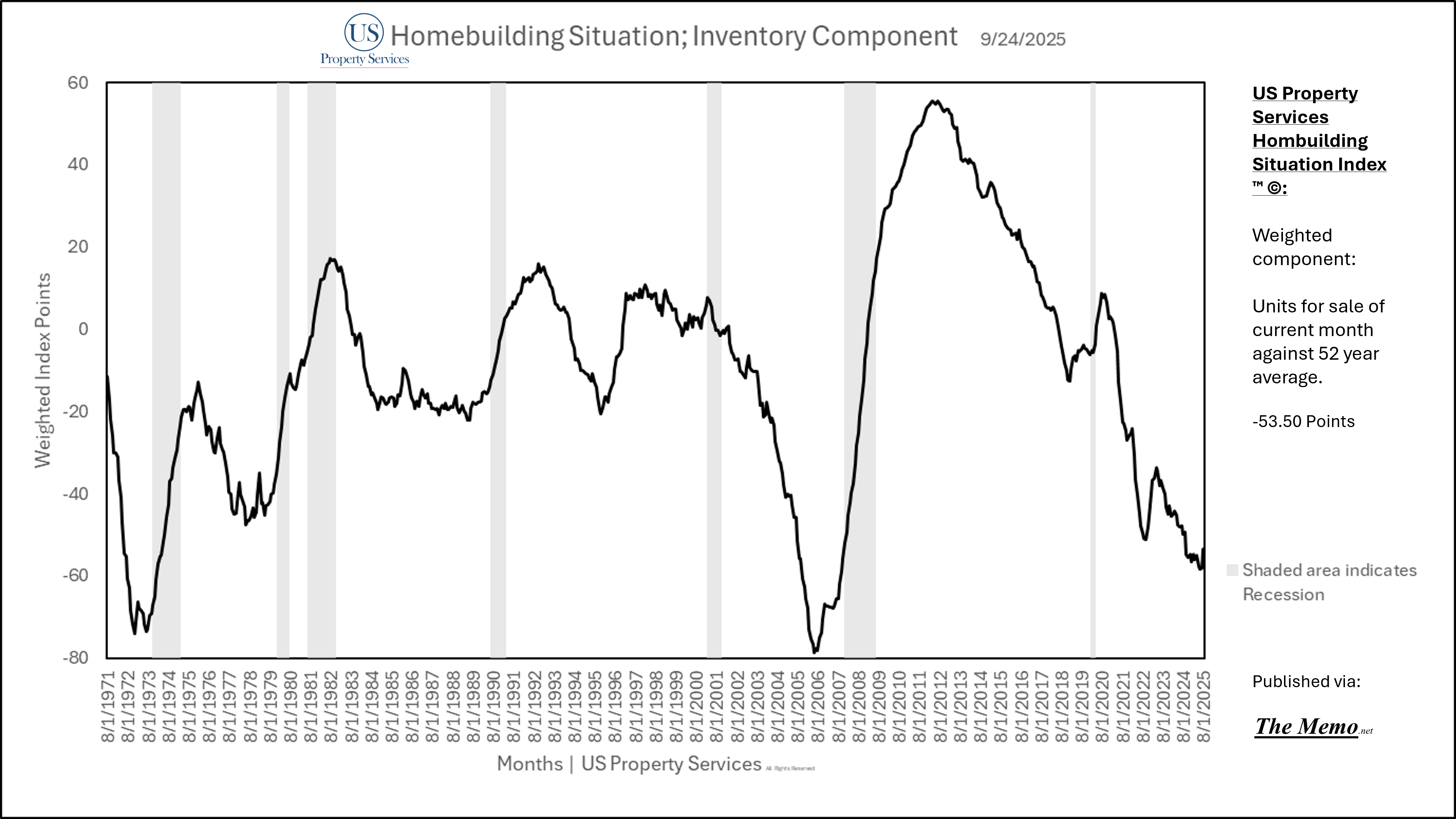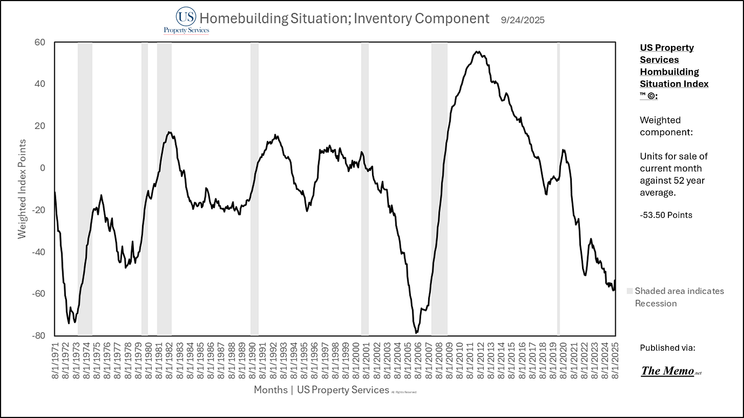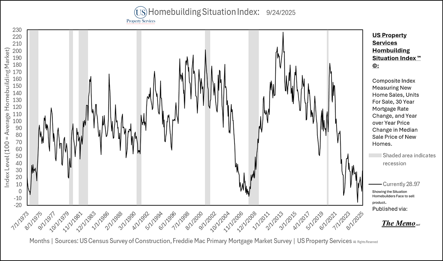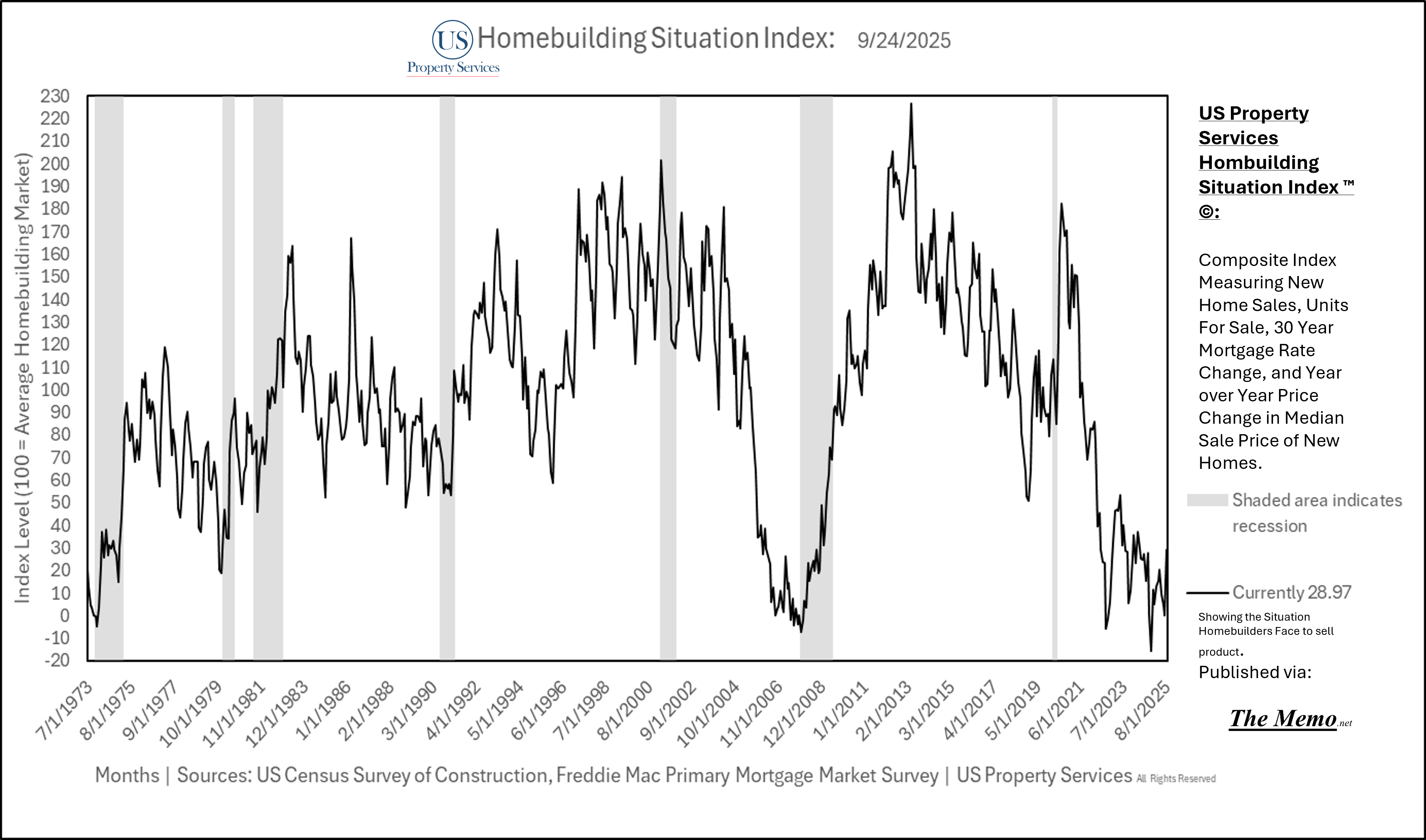The Homebuilding Situation (Composite index measuring sales, inventory, price and mortgage rate direction change) from August 2025 stands at 28.97 This is 71.03 points below the Average Situation for Homebuilders. The is the best situation since April 2024.