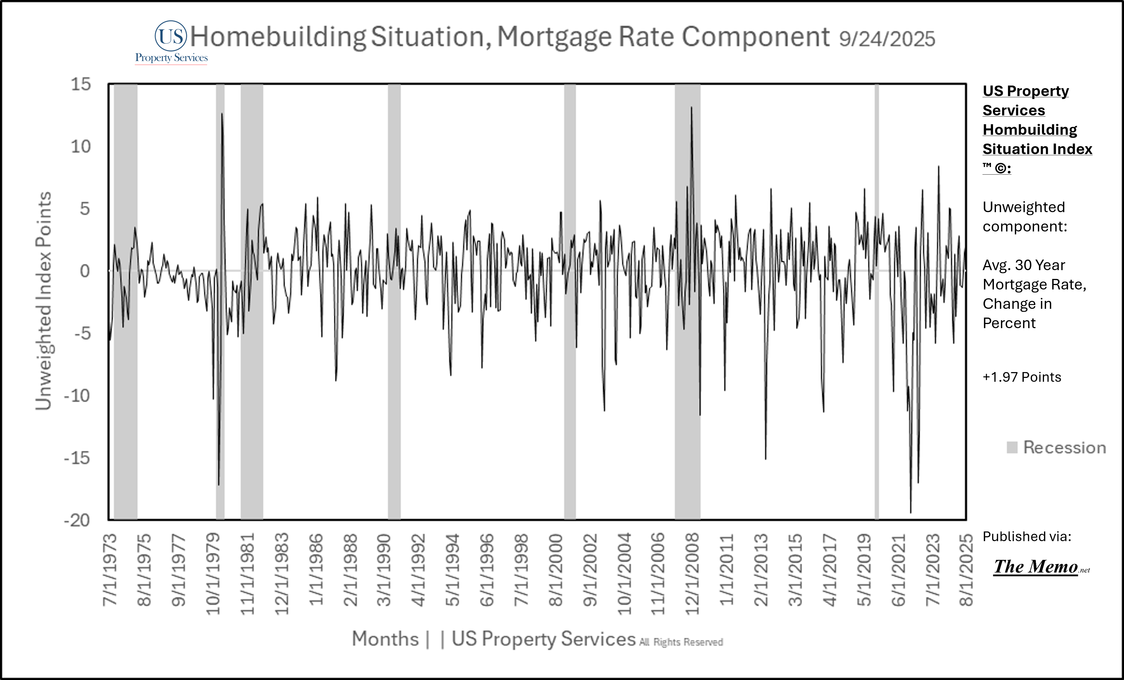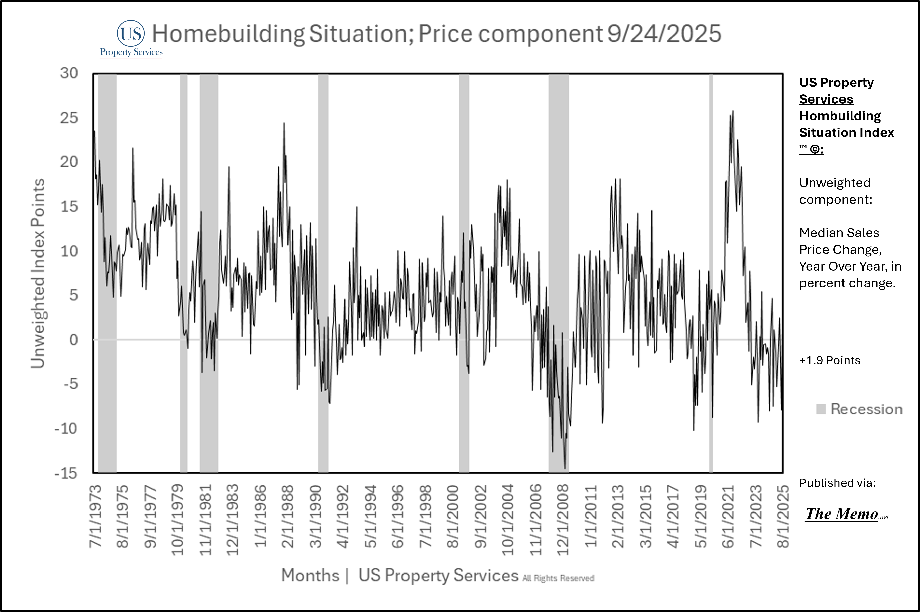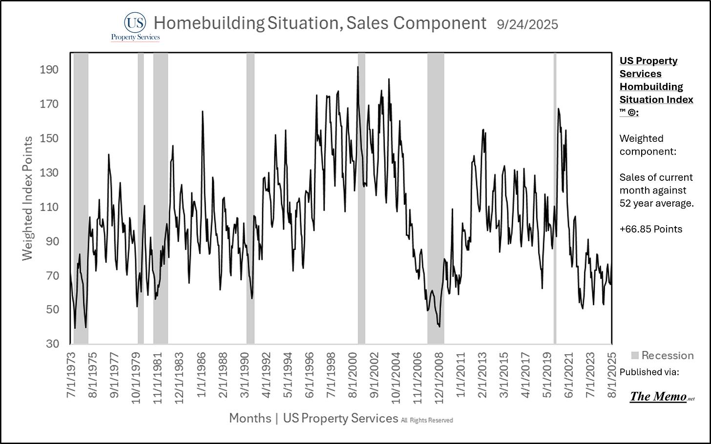 The Homebuilding Situation (Composite index measuring sales, inventory, price and mortgage rate direction change) from August 2025 stands at 28.97 This is 71.03 points below the Average Situation for Homebuilders. The is the best situation since April 2024.