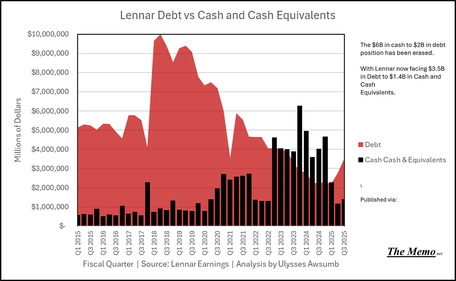 Which means they definitely lost the plot after telling me “The debt load is great” while Lennar went from net positive Cash and Cash Equivalents to net negative vs their Debt.