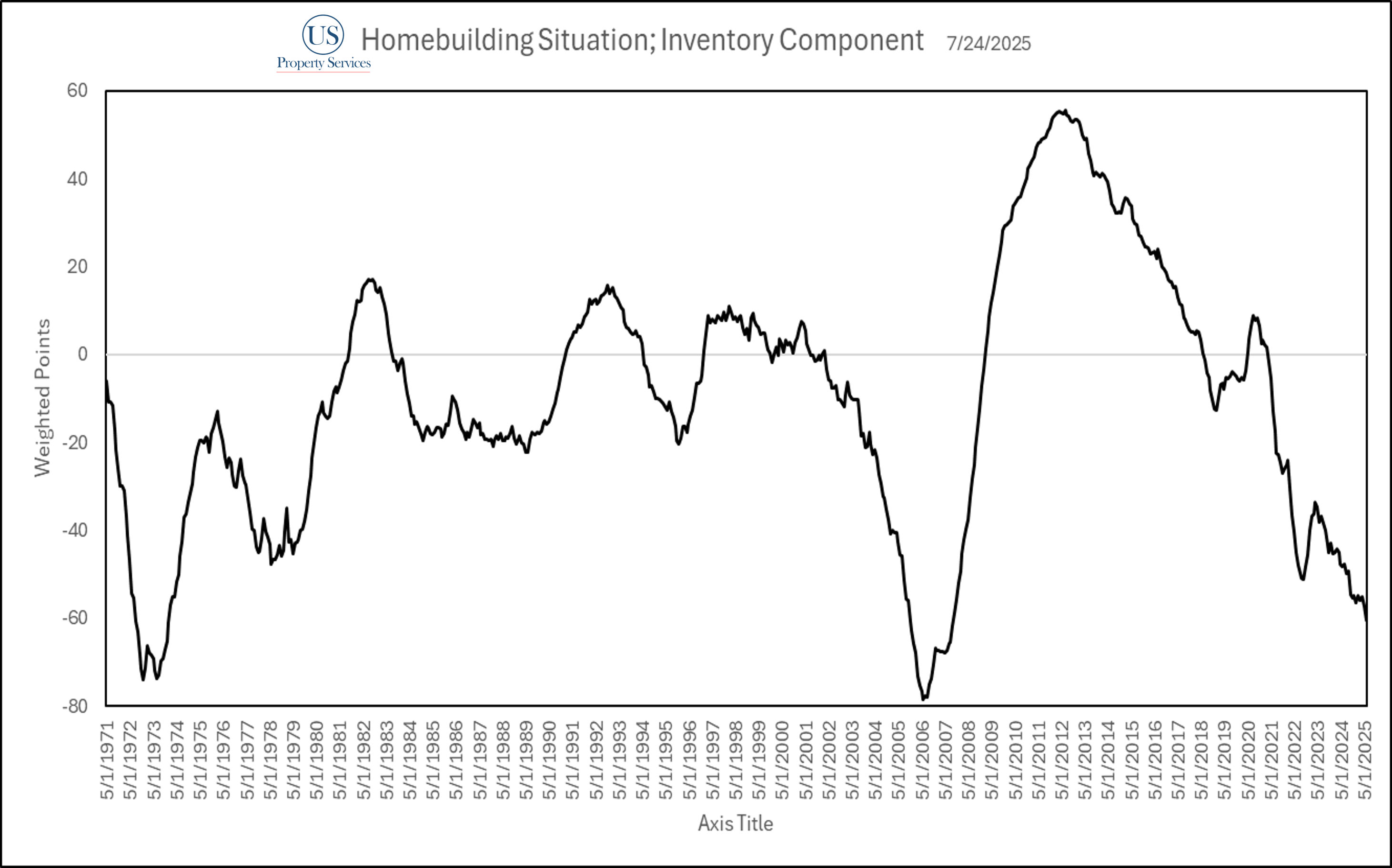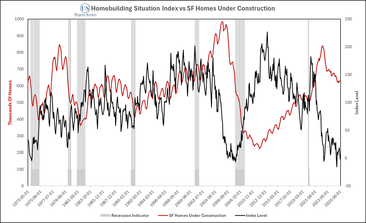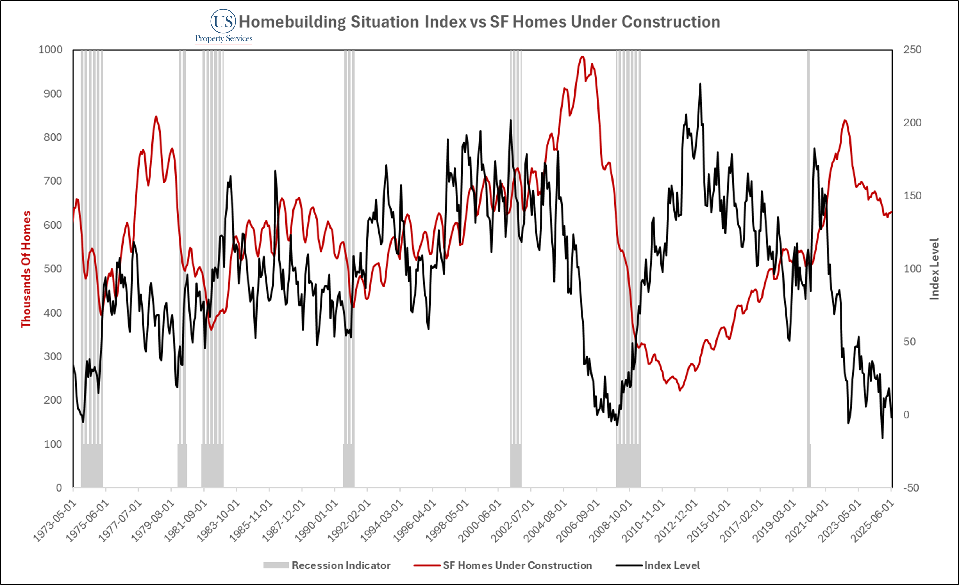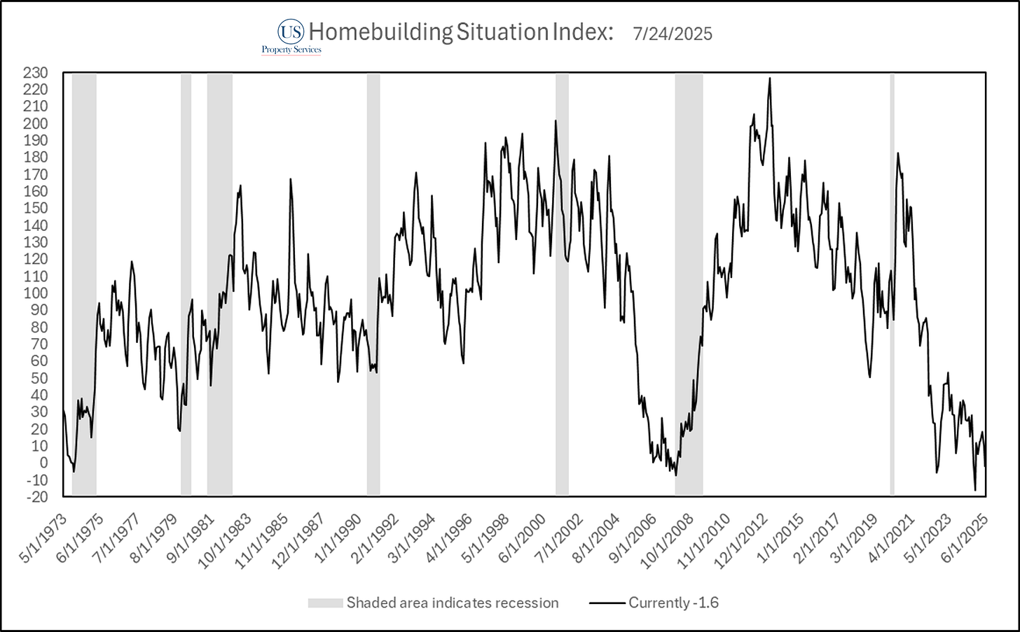 The Homebuilding Situation (Composite index measuring sales, inventory, price and mortgage rate direction change) from June 2025 stands at -1.6. This is 101.6 points below the Average Situation for Homebuilders. The situation decreased by 10.8 points. The current level stands among the worst recorded by the index.
