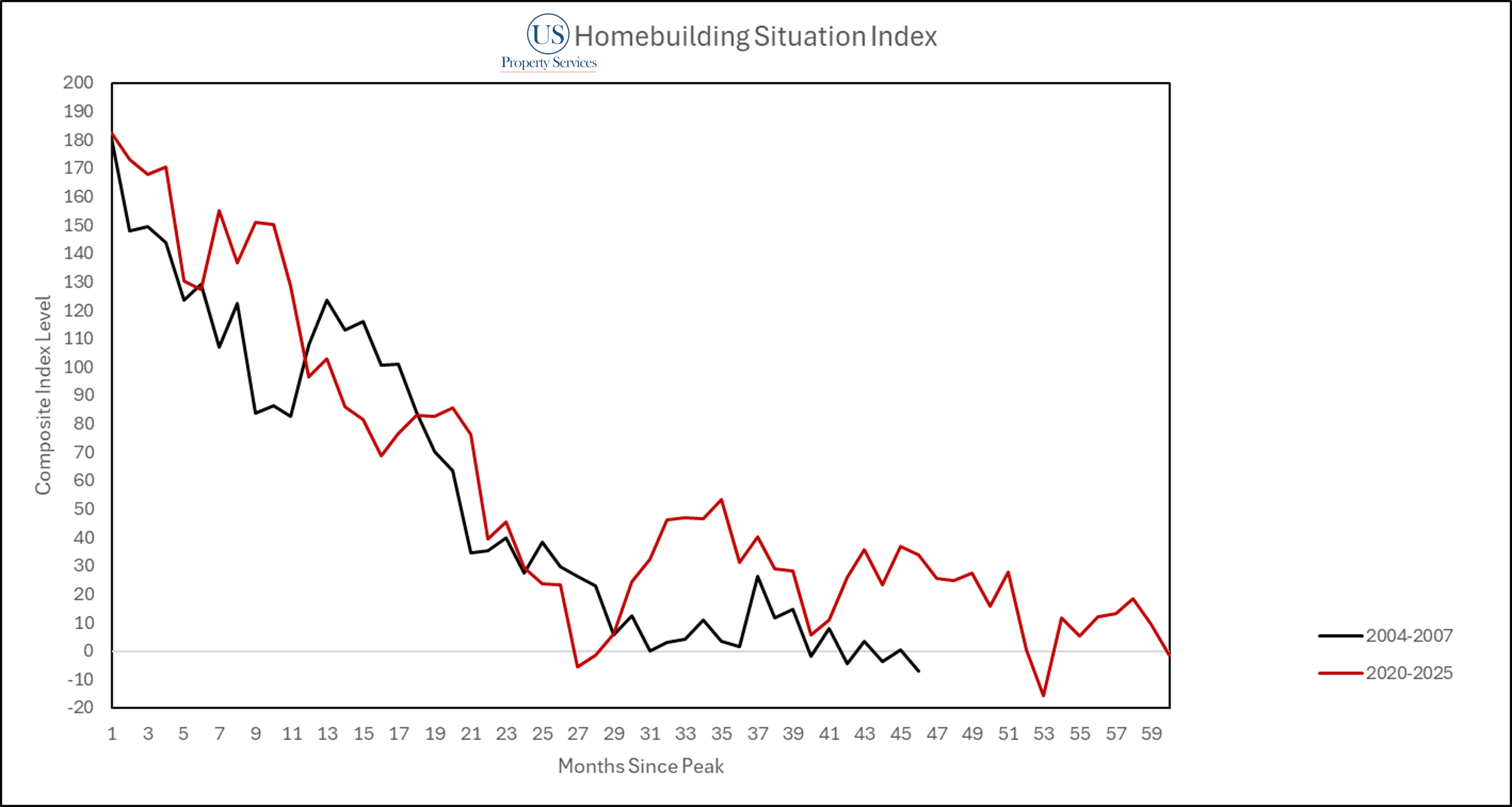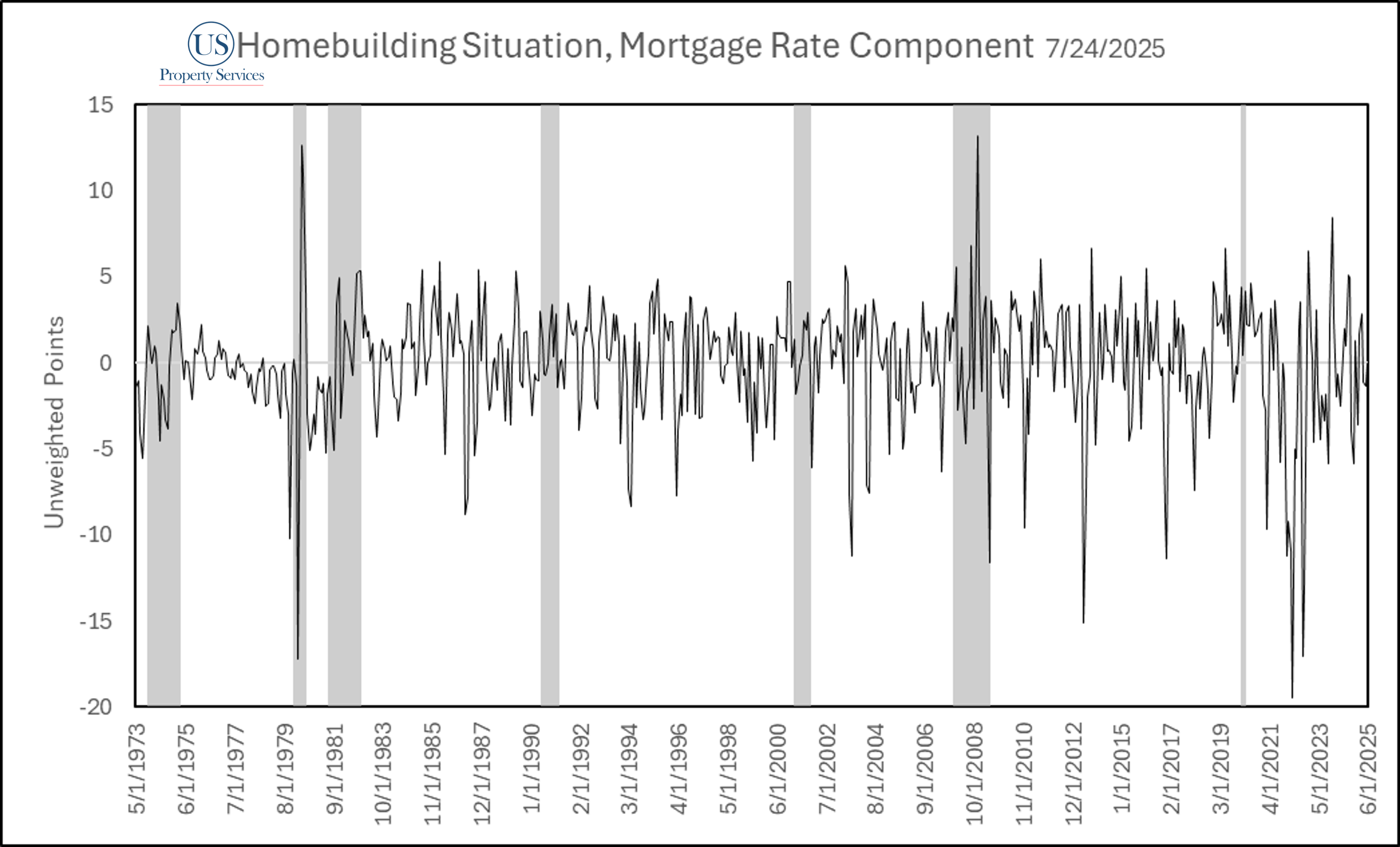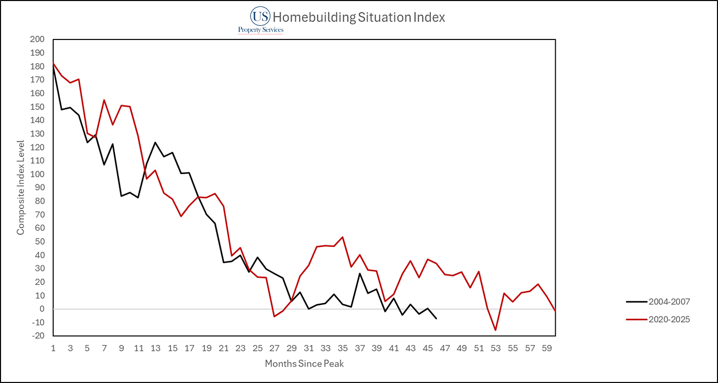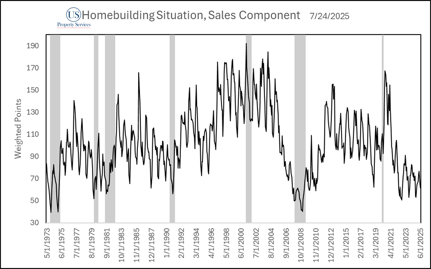 The Homebuilding Situation (Composite index measuring sales, inventory, price and mortgage rate direction change) from June 2025 stands at -1.6. This is 101.6 points below the Average Situation for Homebuilders. The situation decreased by 10.8 points. The current level stands among the worst recorded by the index.