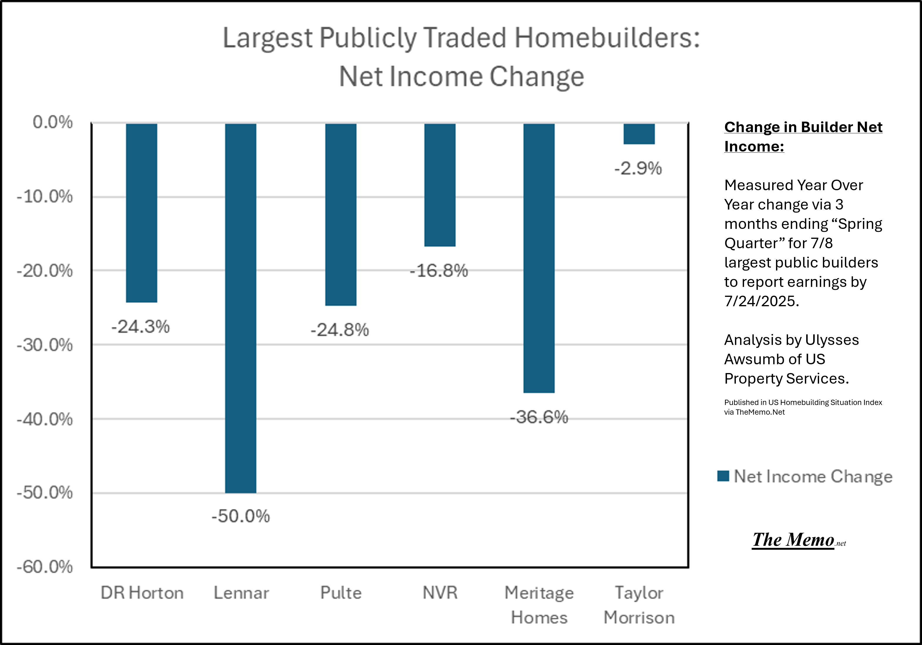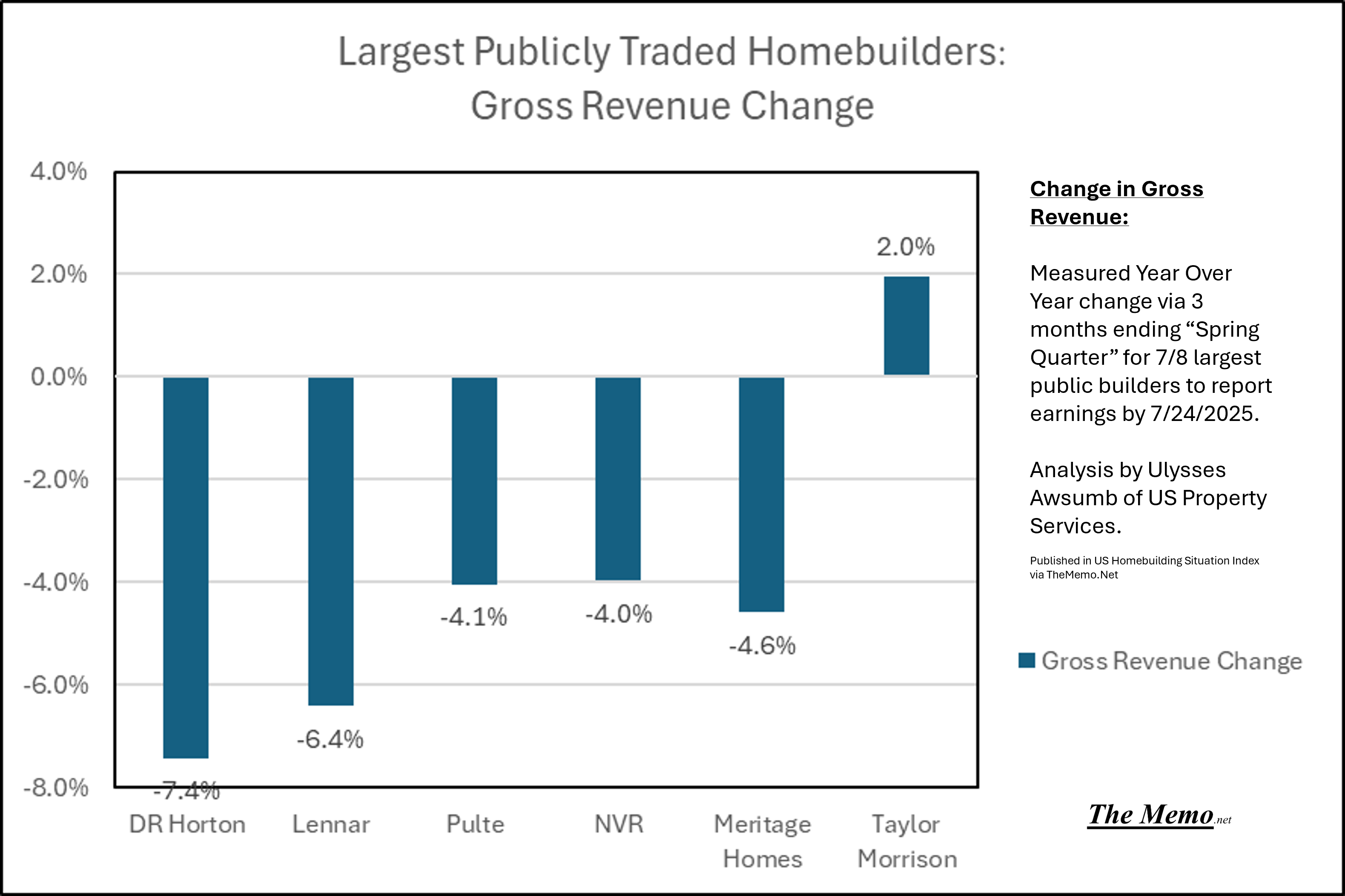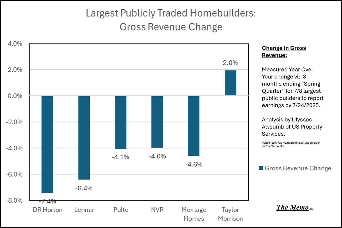 The end of Q2 2025 for 6 of the 7 largest publicly traded homebuilders to report earnings (less KB Homes) was particularly challenging financially. On a 3 months ending “Spring Quarter” Year Over Year basis: