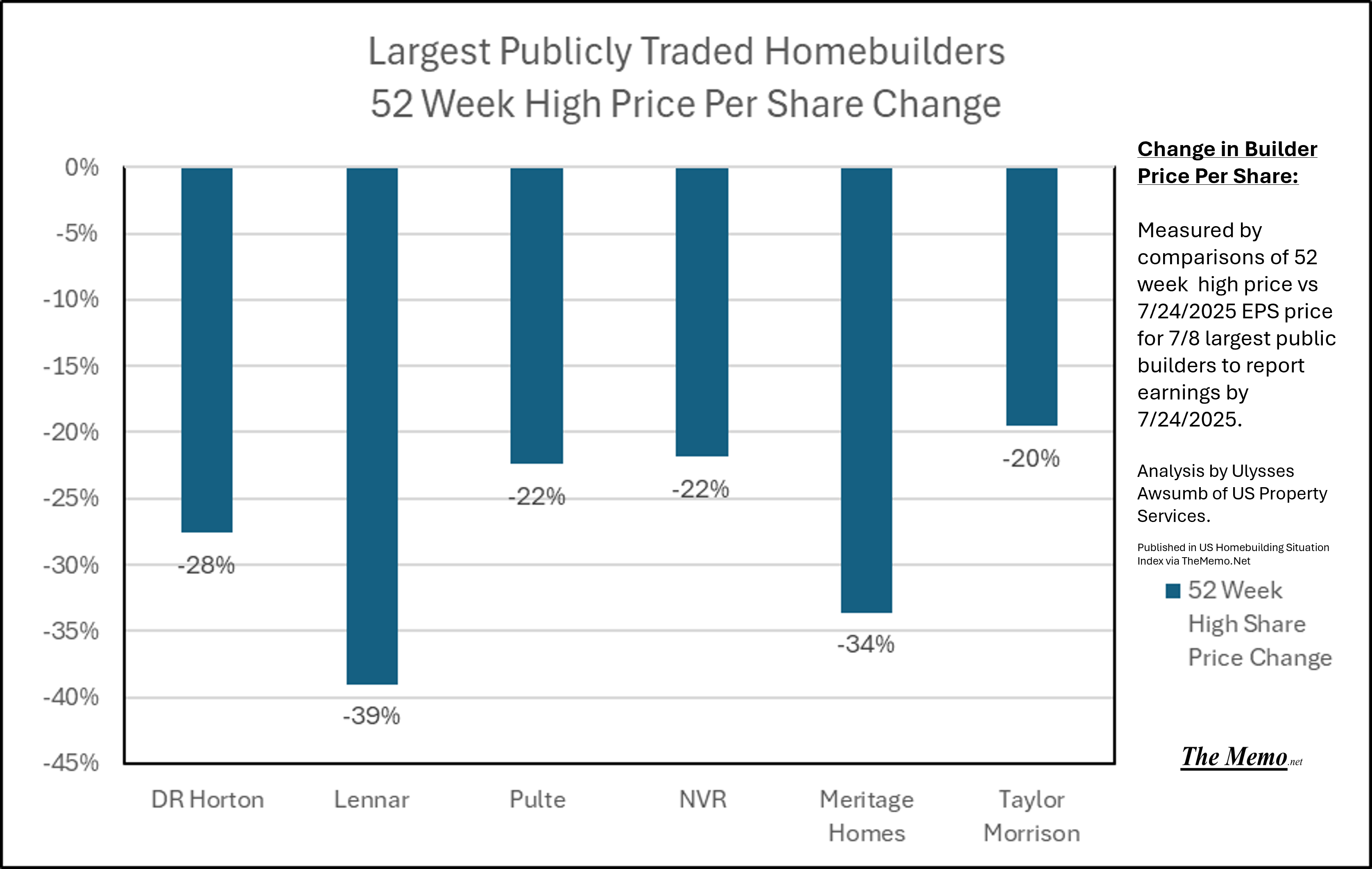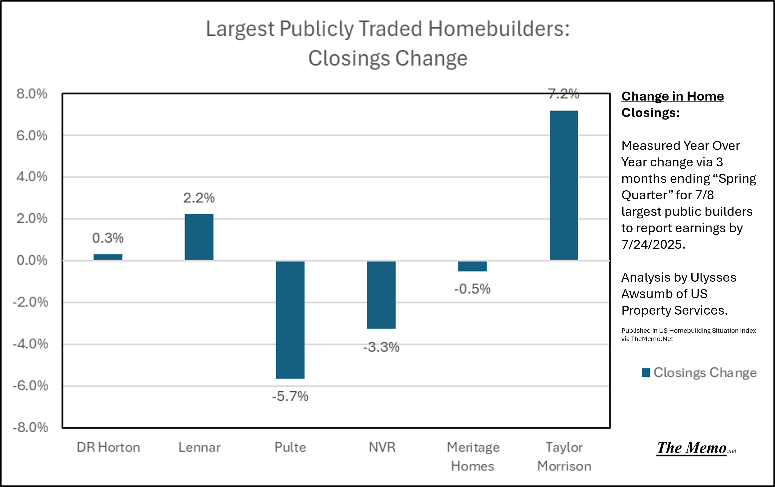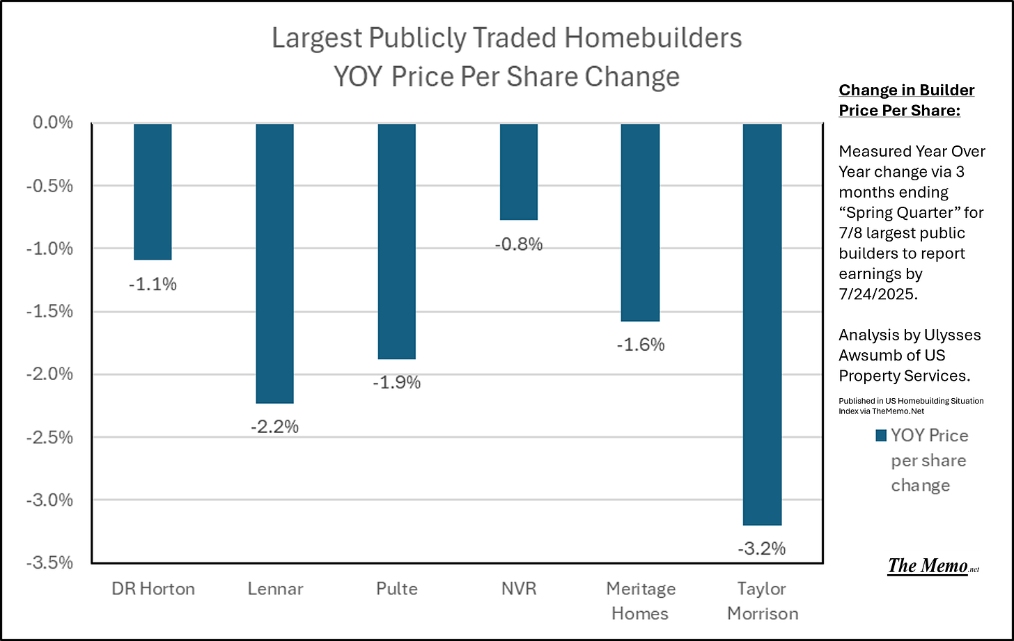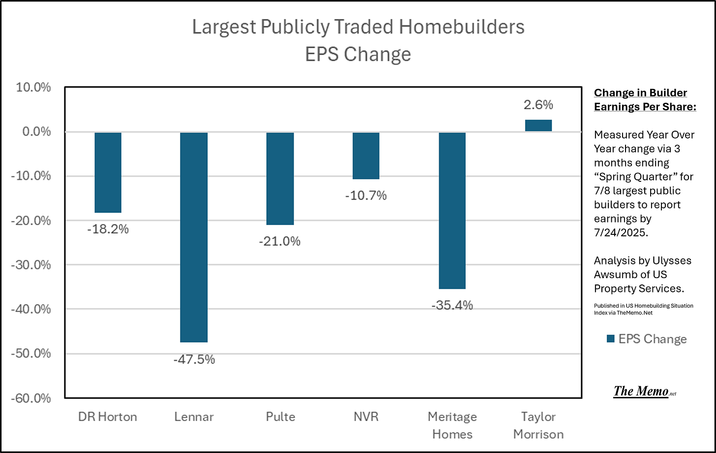 The end of Q2 2025 for 6 of the 7 largest publicly traded homebuilders to report earnings (less KB Homes) was particularly challenging financially. On a 3 months ending “Spring Quarter” Year Over Year basis: