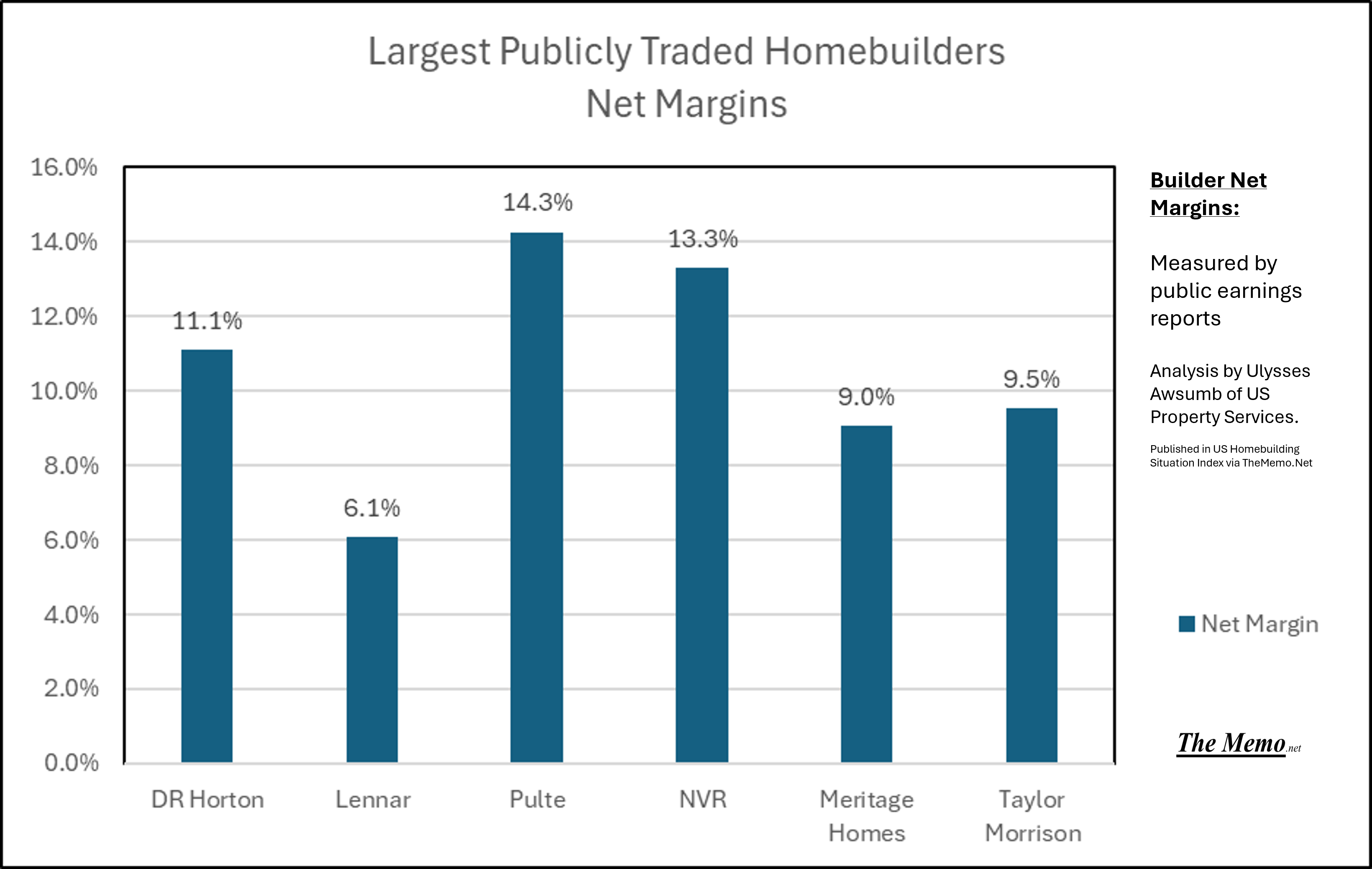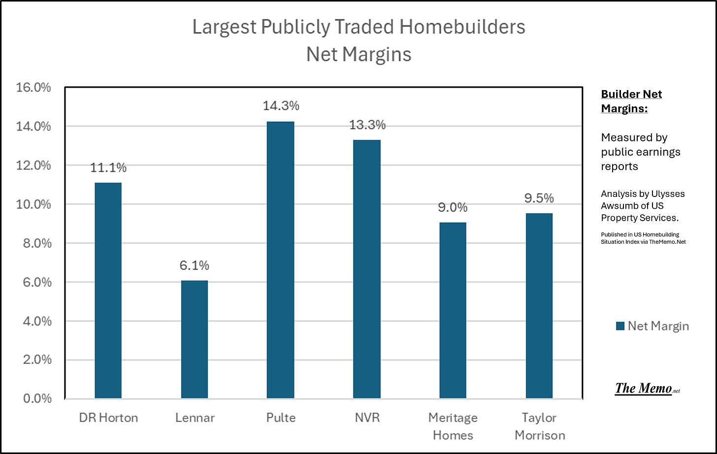 While much discussed, Gross Margins are a relatively useless metric outside of setting pricing for Goods and Services sold. Net Margins however, represent an accurate depiction of what percent of revenue, a company retains as actual earnings. To that end, all 6 reported Net Margins under 15%. 3 of 6 under 10% with Lennar, the 2nd largest builder in the country, posted a 6.1% net margin.