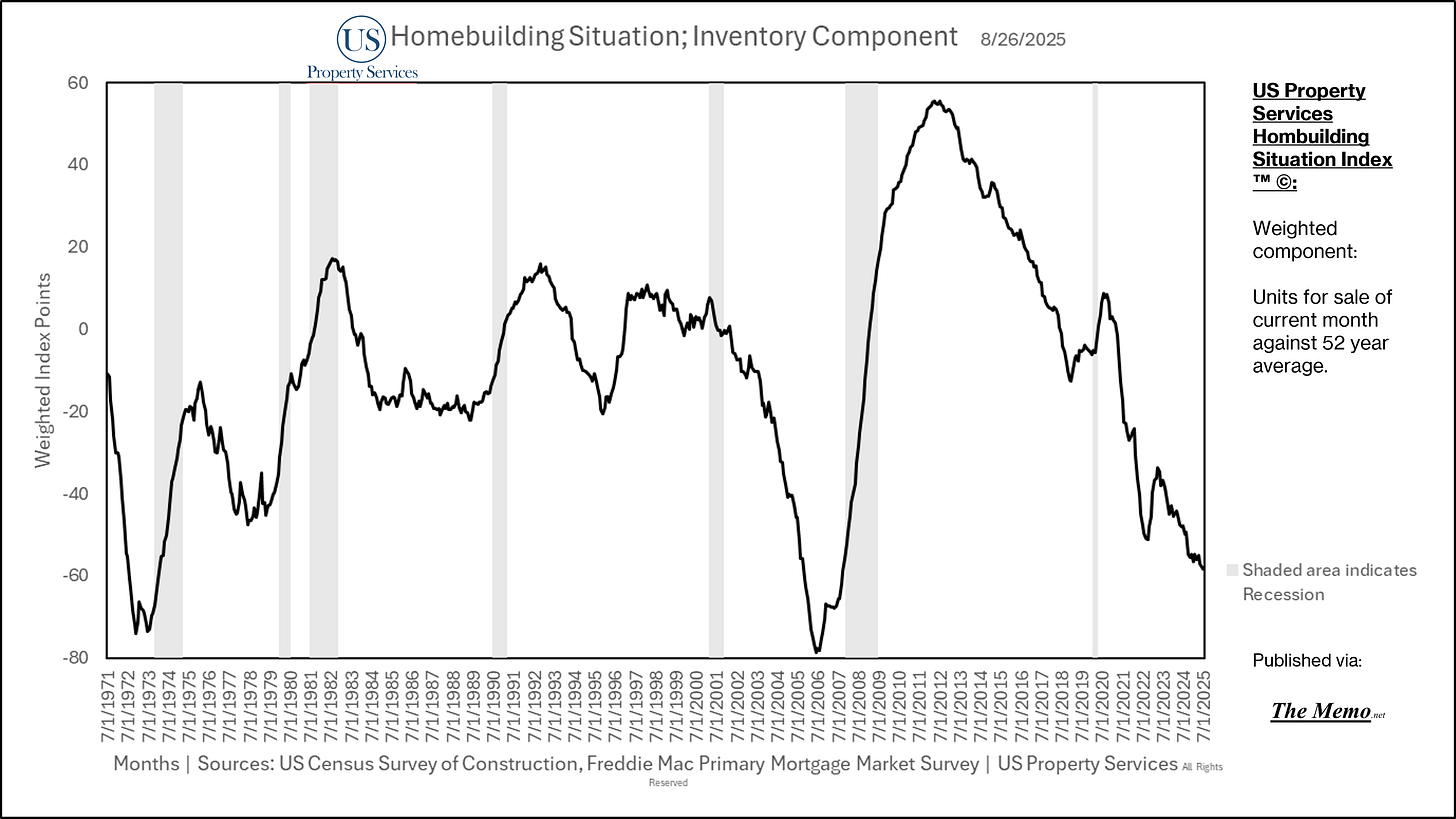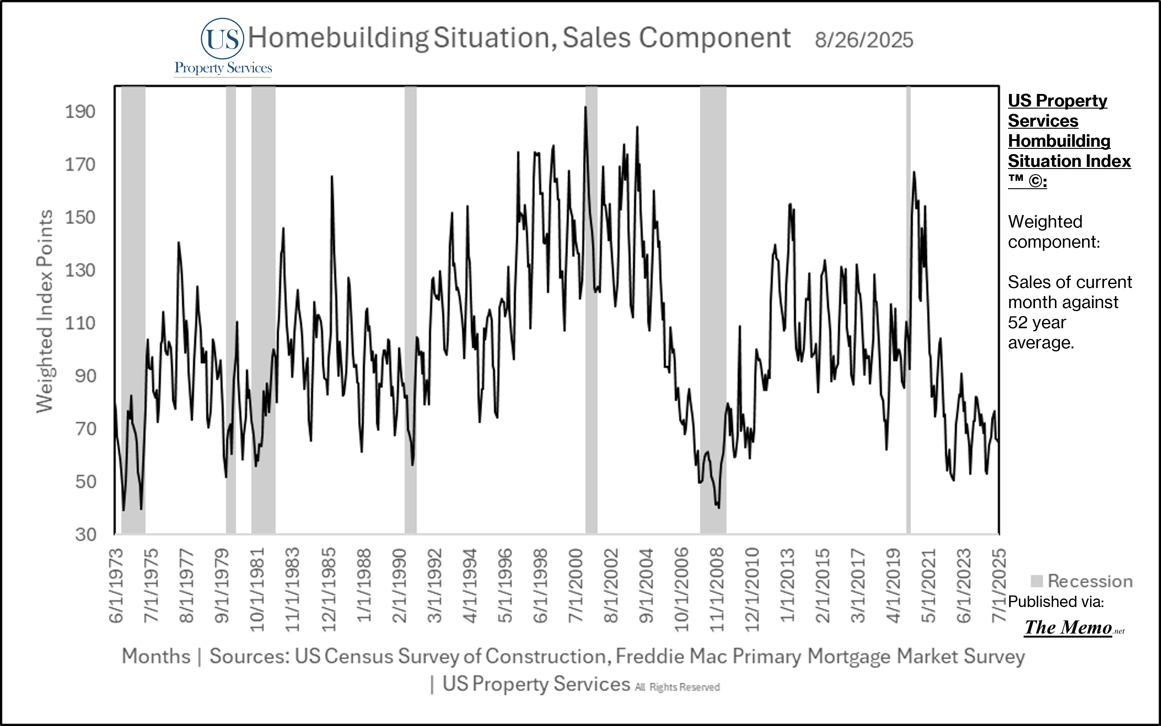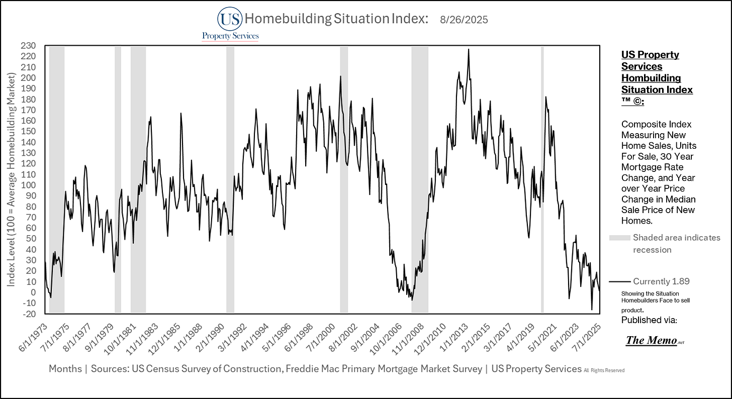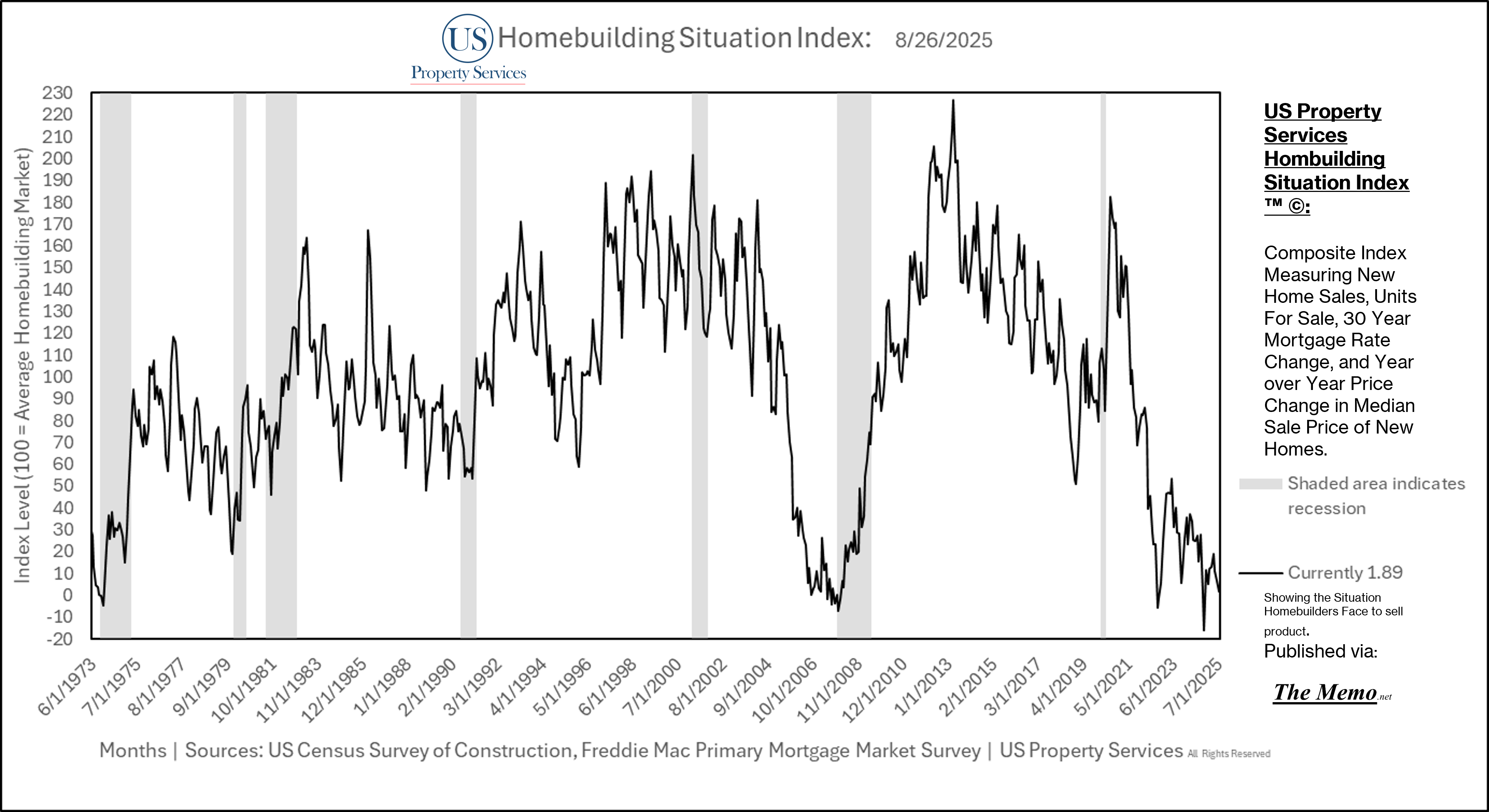 The Homebuilding Situation (Composite index measuring sales, inventory, price and mortgage rate direction change) from July 2025 stands at 1.89 This is 98.11 points below the Average Situation for Homebuilders. The situation increased by 2 points.