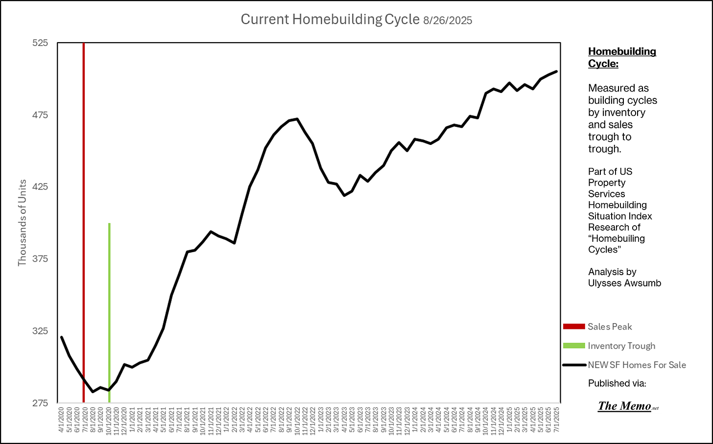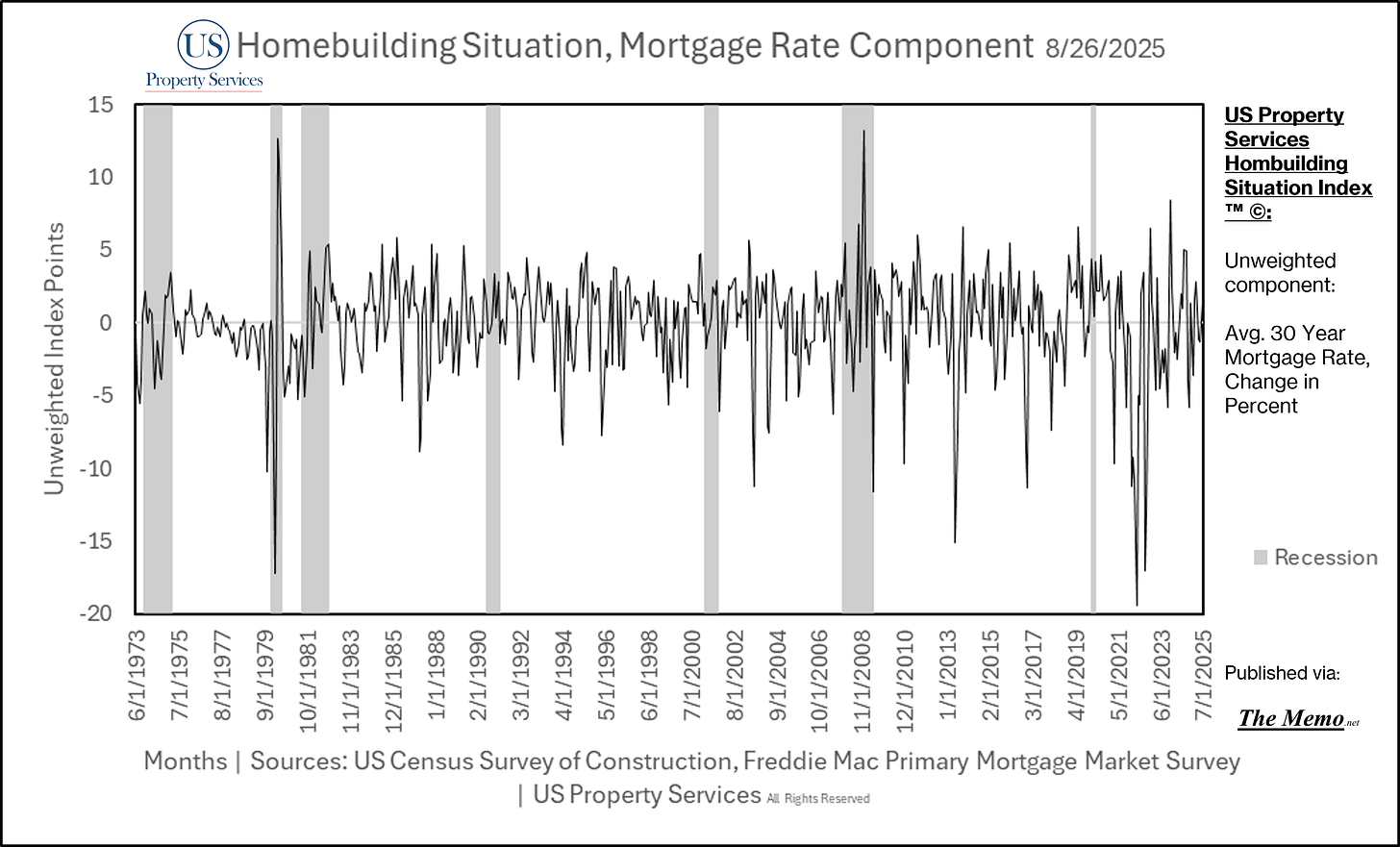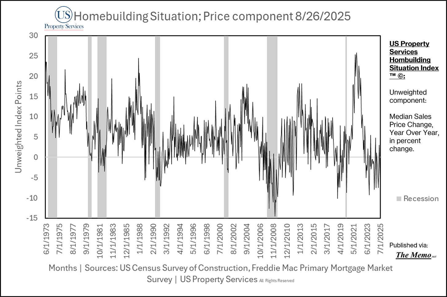 The Homebuilding Situation (Composite index measuring sales, inventory, price and mortgage rate direction change) from July 2025 stands at 1.89 This is 98.11 points below the Average Situation for Homebuilders. The situation increased by 2 points.