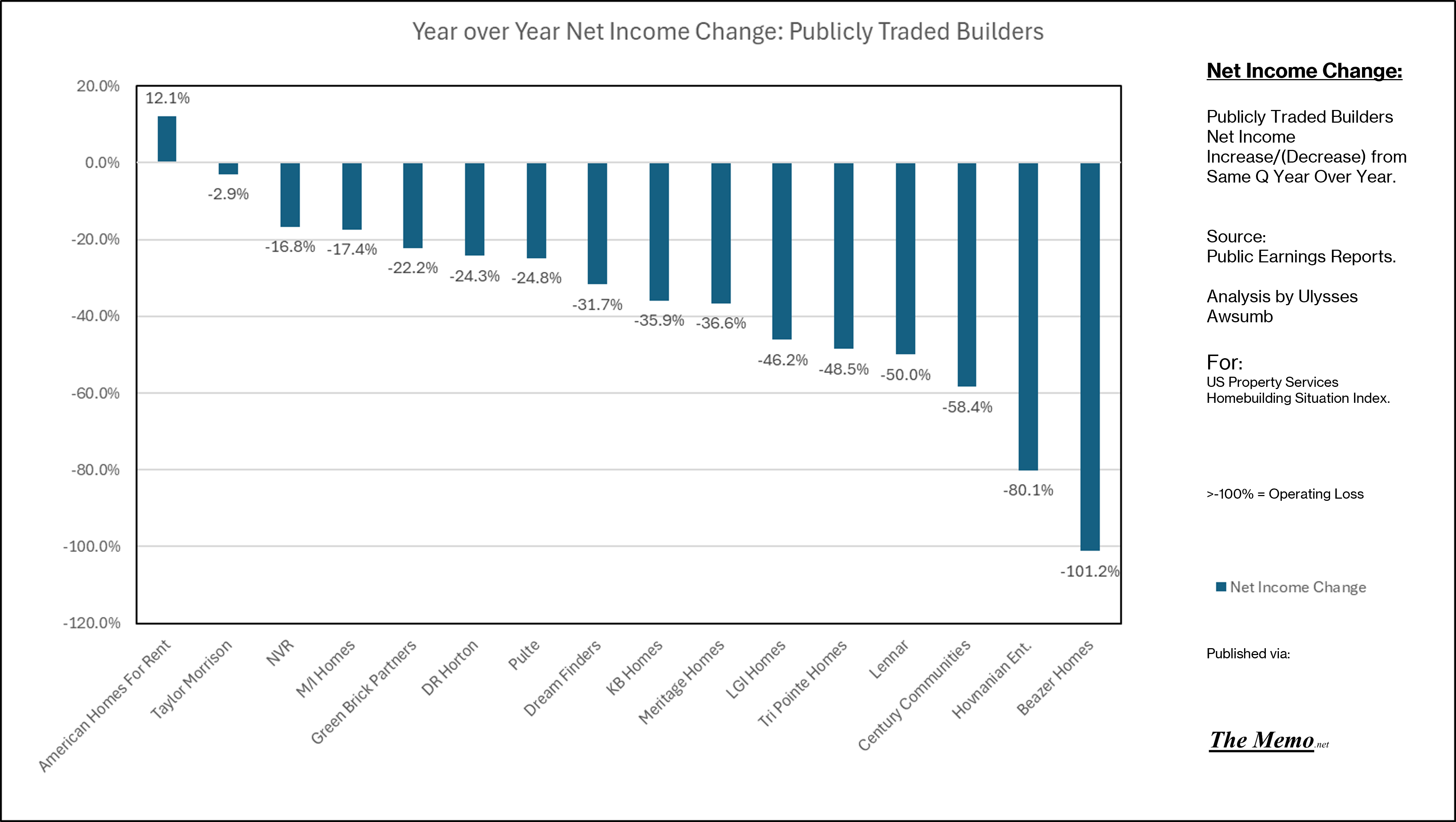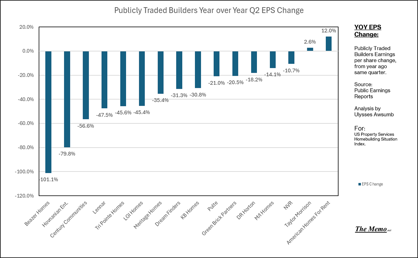 Q2 Earnings have been released for the majority of the 20 largest publicly traded homebuilders. Amongst the 16 builders analyzed, the average Net Income change on a same quarter year over year basis was -36.6%. The biggest change was -101.2% as Beazer Homes reported an operating loss. Rounding out the bottom 4, K Hovnanian saw net income decline -80%, Century Communities -58% and Lennar -50%.
