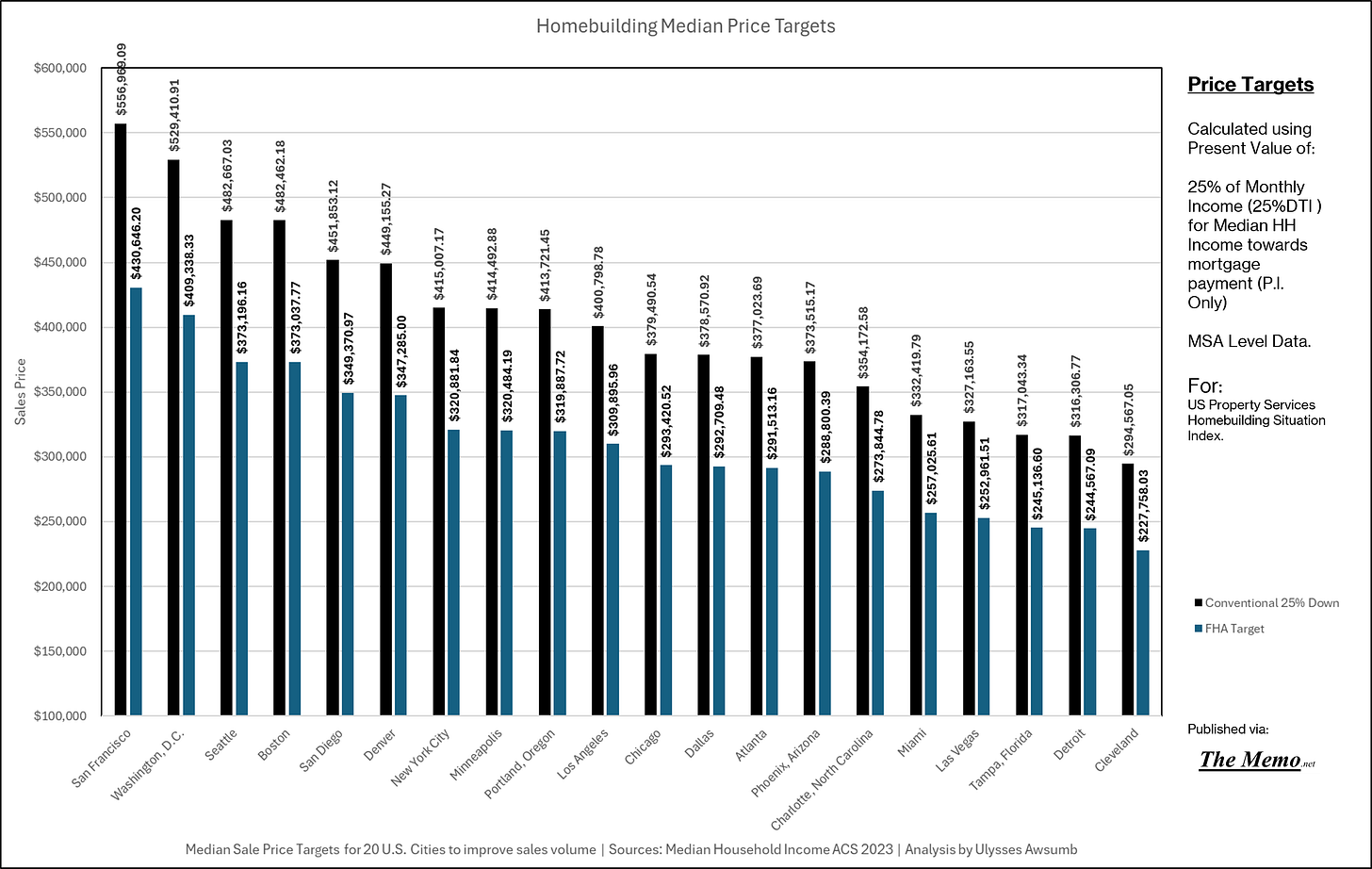 The Median Household Income for these 20 MSAs was $89,515 with ranges from $67-127,000. By using a 25% DTI (Debt to income) ratio, Median Price targets have been calculated for two sales methods. (25% of monthly income used to approve mortgage).